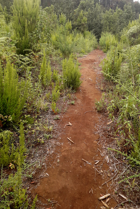 Genau gegenüber geht man in einen schmalen Pfad hinein (nicht auf der Piste). Er führt zwischen viel Gebüsch auf die flache Erhebung der Montaña El Cerro zu. Dort sieht man auch einige Erdbeerbäume. Ihre leuchtenden Früchte sind essbar, aber geschmacklos. Wenn sie vertrocknet sind, schmecken sie bitter. Nach 200 m steht man am Rand des Kiefernbestandes und geht nach rechts. Es ist ein wunderschöner, ebener, aber teilweise recht wilder Weg. Man muss über umgestürzte Bäume klettern oder sich unten durch ducken.