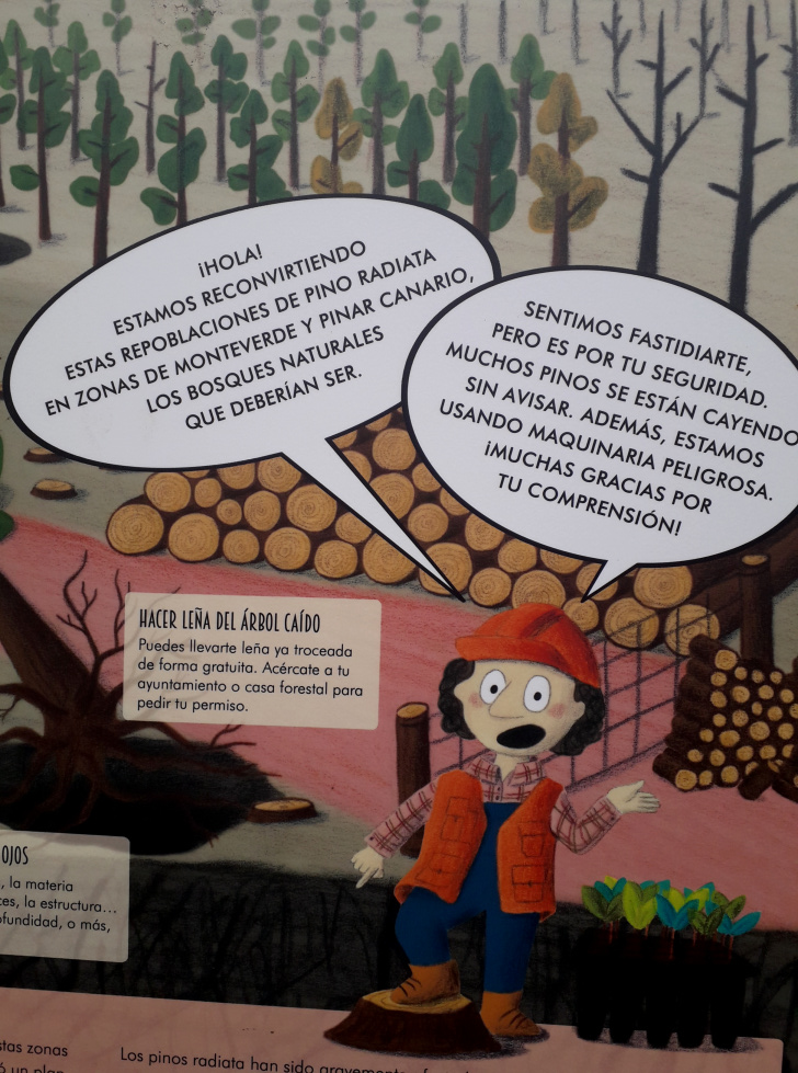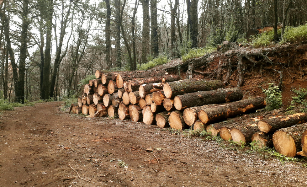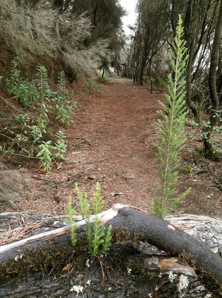 In den 1950er und 60er Jahren wurde auf Teneriffa massiv aufgeforstet. Auf 2000 ha Fläche pflanzte man die Pinus radiata, die kalifornische Kiefer, die schnell wächst und schnell Holz liefert. Und man pflanzte sie hier im feuchten Monteverde, damit sie noch besser wächst. Doch das Holz dieser Bäume konnte nie genutzt werden. Sie wuchsen unter schlechten Bedingungen, denn sie wurden viel zu dicht gepflanzt mit wenig Raum für die Wurzeln. Sie sind auch nicht windbeständig, mehrere Stürme (1996, 2002, 2006, 2010) zerstörten 850 ha. Deshalb verfolgt das Landwirtschaftsministerium schon seit vielen Jahren einen Plan zum nachhaltigen Wiederaufbau des Waldes mit heimischen Arten und der kanarischen Kiefer. Dann kam der Waldbrand von 2023, der weitere 400 ha des Kiefernbestandes zunichte machte.