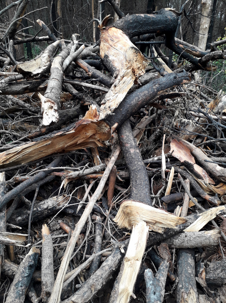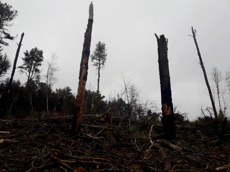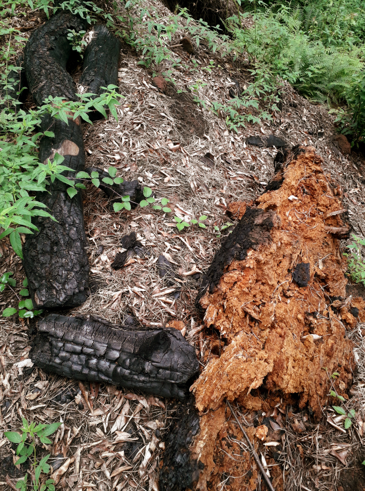 Wie man erkennt, ist das Holz im Innern noch nicht verbrannt, trotzdem waren die Bäume nicht mehr zu retten, denn der Brand hat zu lange gedauert und dadurch auch den Wurzelbereich und die gesamte Bodenstruktur zerstört. Die Bäume können kein Wasser mehr aufnehmen und würden über kurz oder lang absterben. Durch den Kahlschlag wird versucht zu retten, was noch geht.