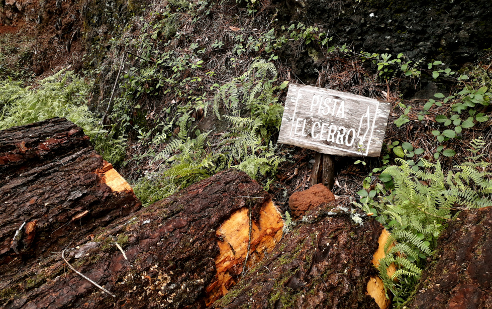 Nun geht es im Gegenuhrzeigersinn rund um die Montaña El Cerro, bis man nach etwa 1 km zu einer auffälligen Weggabelung kommt. Dort nimmt man den rechten Weg, der gleich danach aus dem Wald herausführt und auf die Pista El Cerro trifft.