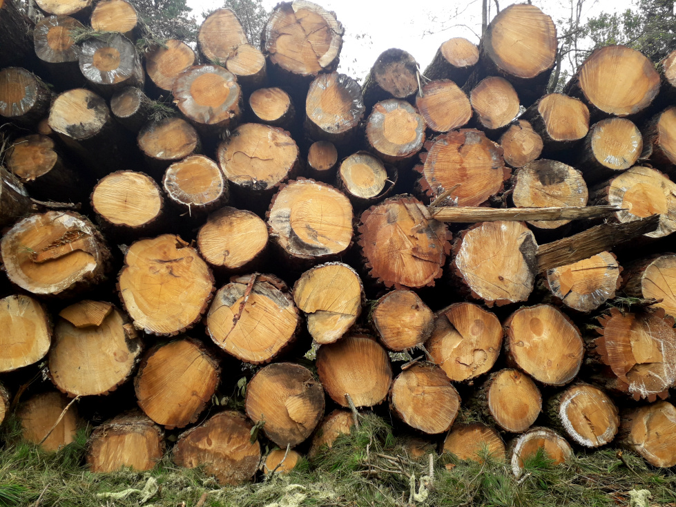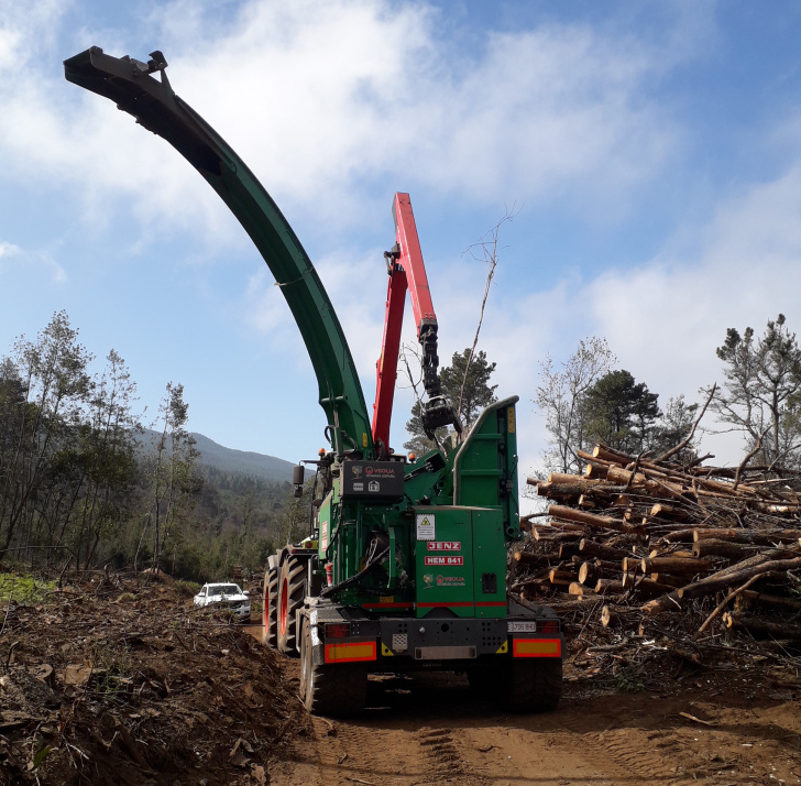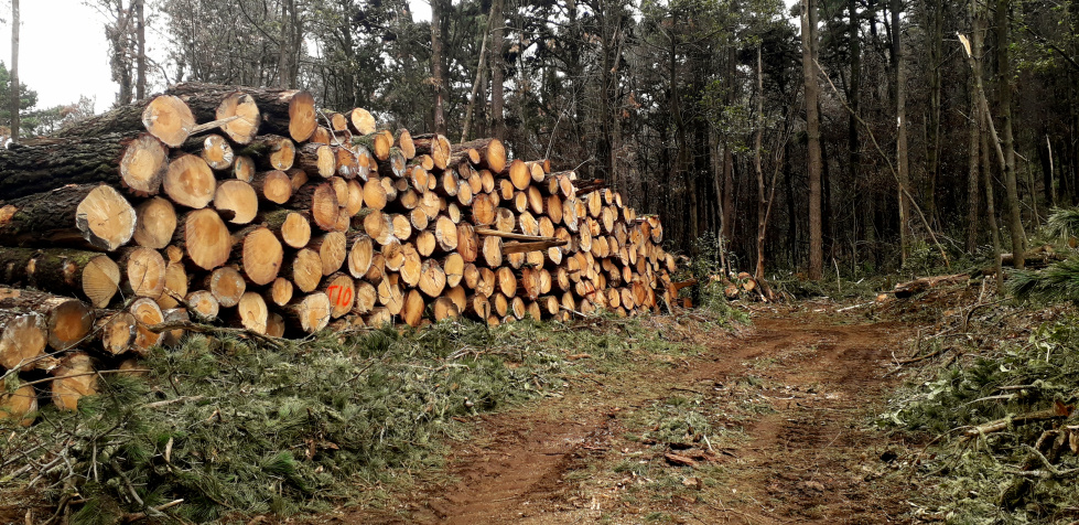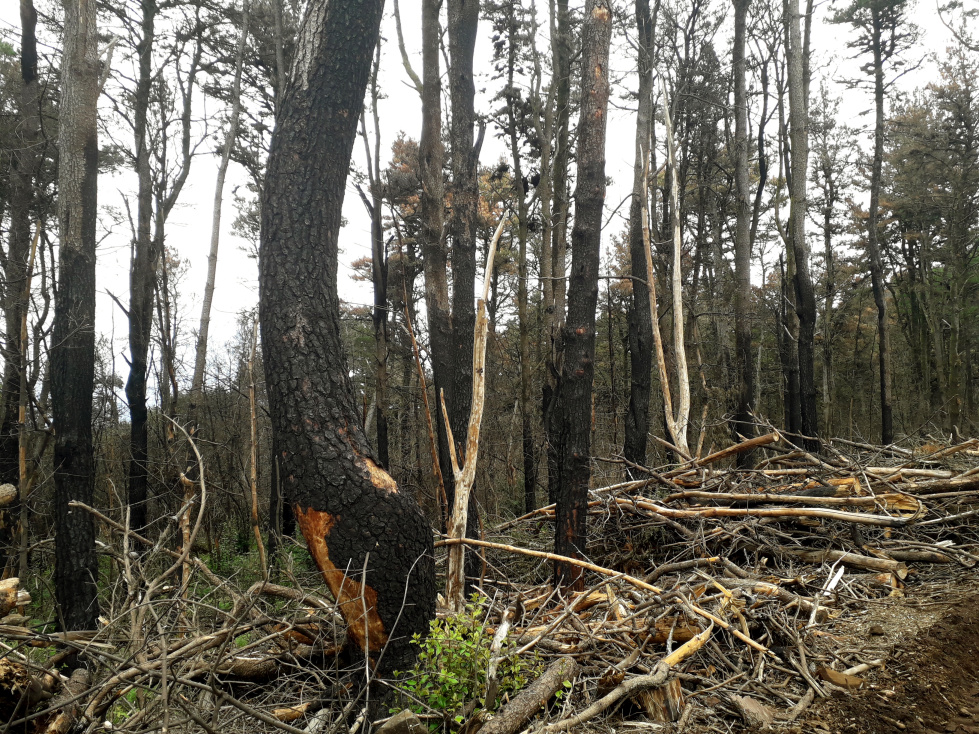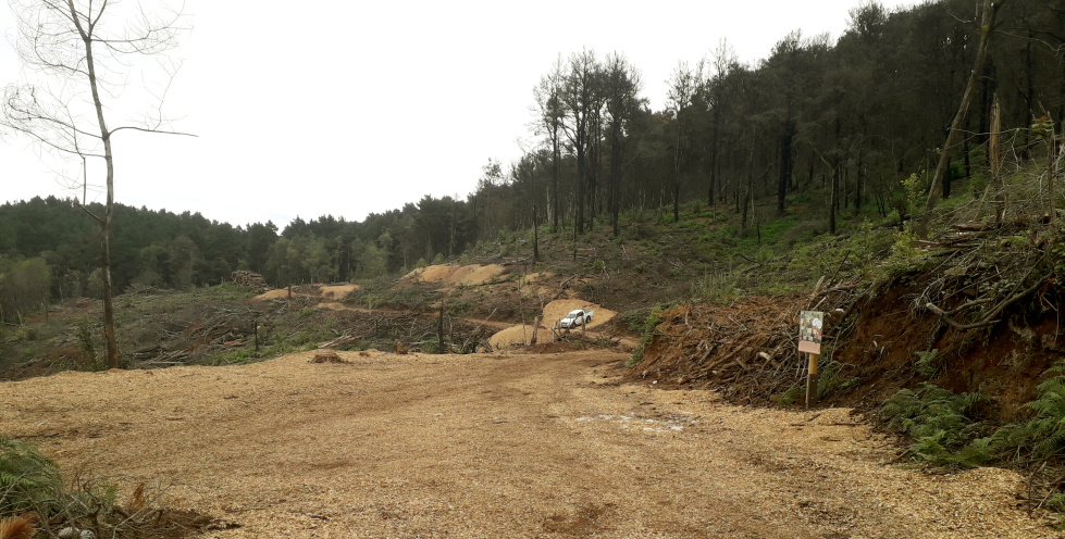 Diese biegt nach rechts wieder in den Wald hinein und geht leicht abwärts. Nach 300 m trifft man auf die Pista La Herradura. Hier beginnt nun die Zone, in der umfangreiche Waldarbeiten stattfinden. Riesige Holzstapel liegen am Weg, und Berge von Ästen sind auf beiden Seiten noch zu beseitigen. Da fast alle Bäume hier nachhaltig geschädigt sind, muss man verhindern, dass diese auf die Piste stürzen und sie blockieren könnten. Dazu wird beiderseits ein Streifen von jeweils 35 m Breite abgeholzt. Viel Arbeit und viel Holz!