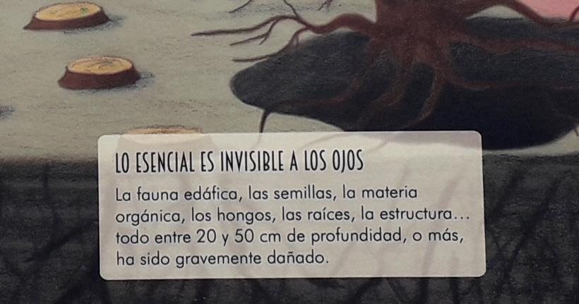 In der anderen Richtung führt die Pista La Herradura bergab, in einer weiten Rechts- und wieder Linkskurve, in einer traurigen Landschaft. 600 m weiter unten trifft sie auf die Pista Cuatro Veredas. Dort hat die Forstverwaltung eine Hinweistafel aufgestellt, die nicht nur um Verständnis für diese umfangreichen Arbeiten bittet, sondern auch viele Details erklärt.