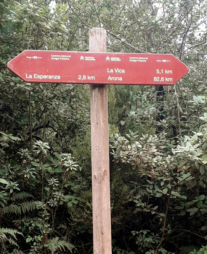 Zunächst geht man genau gegenüber, auf der linken Seite, auf einem Wanderweg in den Wald hinein, der gleich nach rechts dreht und etwas bergauf führt. Dort sind, wie man an den Spuren sieht, auch viele Mountainbiker unterwegs. Der Weg biegt nach 400 m nach rechts und trifft 150 m weiter wieder auf die Piste. Dort befindet sich der Zaun einer großen Finca, die dem Cabildo gehört.