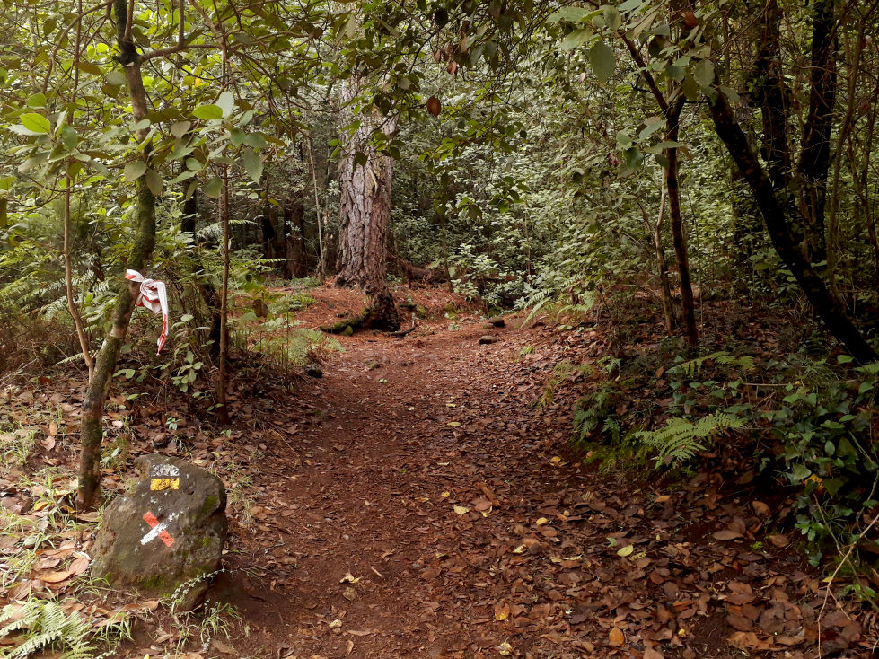 Inzwischen ist es die Pista La Esperanza, auf der auch der Fernwanderweg GR 131 verläuft. Nachdem die Piste wieder im Hochwald verläuft, steht rechts am Weg in einer Kurve ein Wegweiser, der den GR 131 anzeigt. 10 m links daneben geht ein Pfad in den Wald hinein, markiert mit einem rot-weißen Kreuz (für den GR 131) und einem gelb-weißen Streifen. Dort geht es kurz etwas steiler bergauf, und danach ganz bequem durch einen herrlichen, schattigen Mischwald aus Lorbeer und Baumheide nach und nach aufwärts.