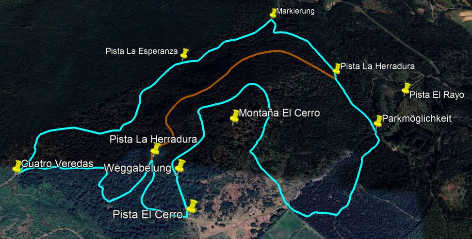 Solange die Waldarbeiten andauern, kann man auf der braunen Pista La Herradura zurück gehen und kommt dann nicht durch das Gebiet der Waldarbeiten. Ganz kurz ist die Umrundung der Montaña El Cerro und der direkte Rückweg auf der Pista El Rayo, auch mit Kindern gut möglich.
