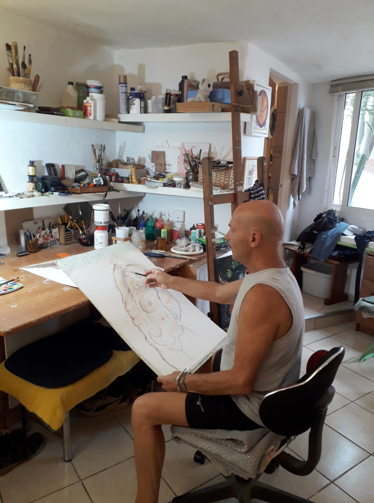 Das Schicksal führte ihn auch auf die Kanaren. Ein Freund lud ihn ein nach Gran Canaria und er kam mit einem One-Way-Ticket. Auf Fuerteventura arbeitete er als Animateur in einem Hotel. Aber zum Verkaufen von Bildern bot die Insel zu wenige Möglichkeiten. So kam er 2001 nach Teneriffa. Auf der Promenade am Lago Martiánez in Puerto de la Cruz begann er, Portraits von Touristen zu zeichnen. Für die Darstellung menschlicher Formen hatte er schon immer eine besondere Begabung. Hier eine Reihe von Aktzeichnungen.