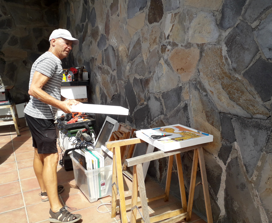 Hossein arbeitet in einem winzigen Studio in Tigaiga, Los Realejos. Er lebt mitten in seiner Arbeit. Er lebt ohne Stress, zeichnet und malt, wann es ihm danach ist. Er ist Maler mit Leib und Seele. Er studierte zwar 2011 auch an der Escuela de Artes Fernando Estévez in Santa Cruz die Kunst der Plastik, aber es war nicht sein Favorit. Ein kleines Selbstportrait steht in seinem Vorgarten.