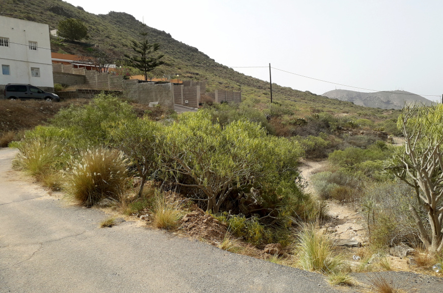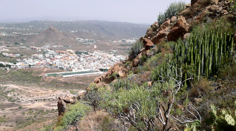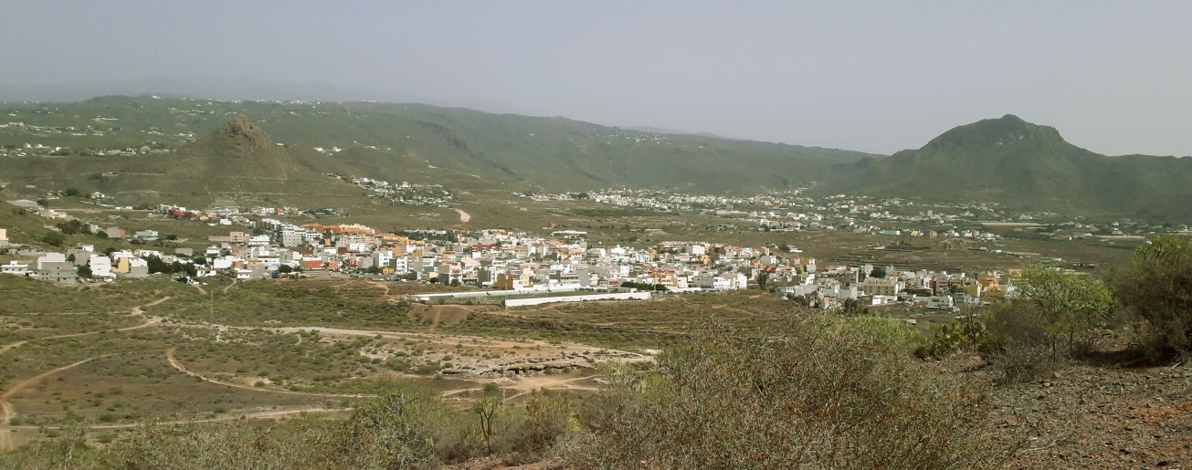 Nun muss man leider ein Stück durch die Stadt gehen. Zuerst über einen wilden Parkplatz und und dann in die schmale Gasse Calle Guacimara hinein, an deren Ende nach rechts bis zu einer größeren Straße, und dort wieder links. 300 m weiter oben biegt man an einem kleinen Kreisverkehr scharf links ab in die Calle La Luz. In der Siedlung 400 m weiter oben biegt man an der vorletzten Querstraße links ab, es ist die Calle El Cercado. Von dort aus geht es durch ein kleines Tal und auf der anderen Seite steil hinauf zum Ausgangspunkt der Wanderung.