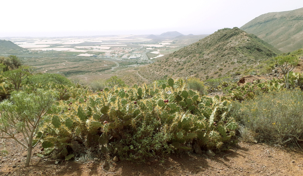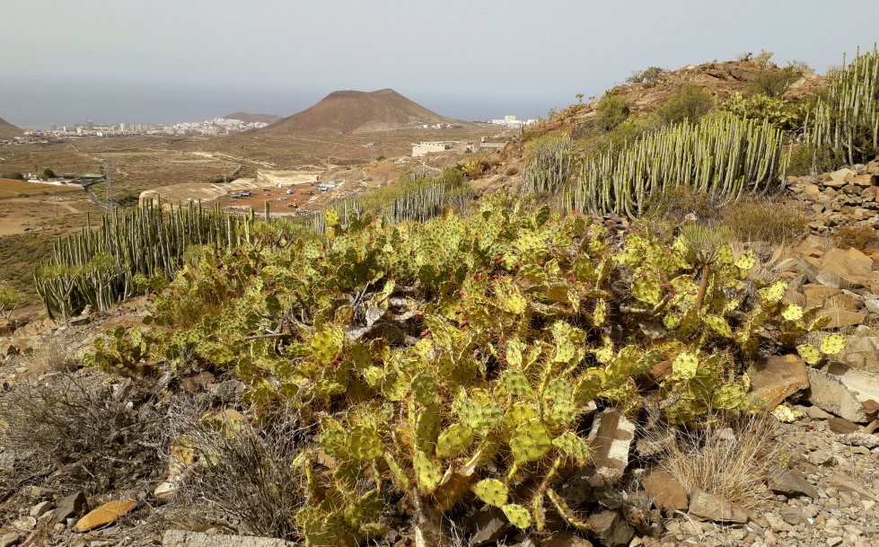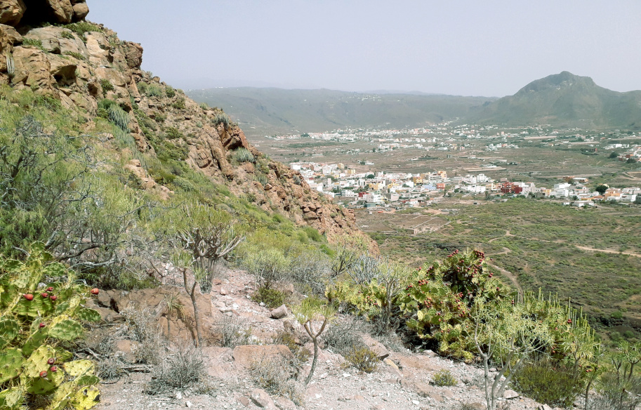 500 m weiter überquert man einen kleinen Rücken und hat jetzt einen Blick hinunter nach Los Cristianos. Weiter geht es am Hang des Roque de Chijafe entlang, bis man zu einem Sattel aufsteigt, wo man wieder in beide Richtungen blicken kann. Links unten liegt der Ort Cabo Blanco, und gerade voraus steht der Roque Igara, der von hier aus schon ganz beachtlich aussieht.