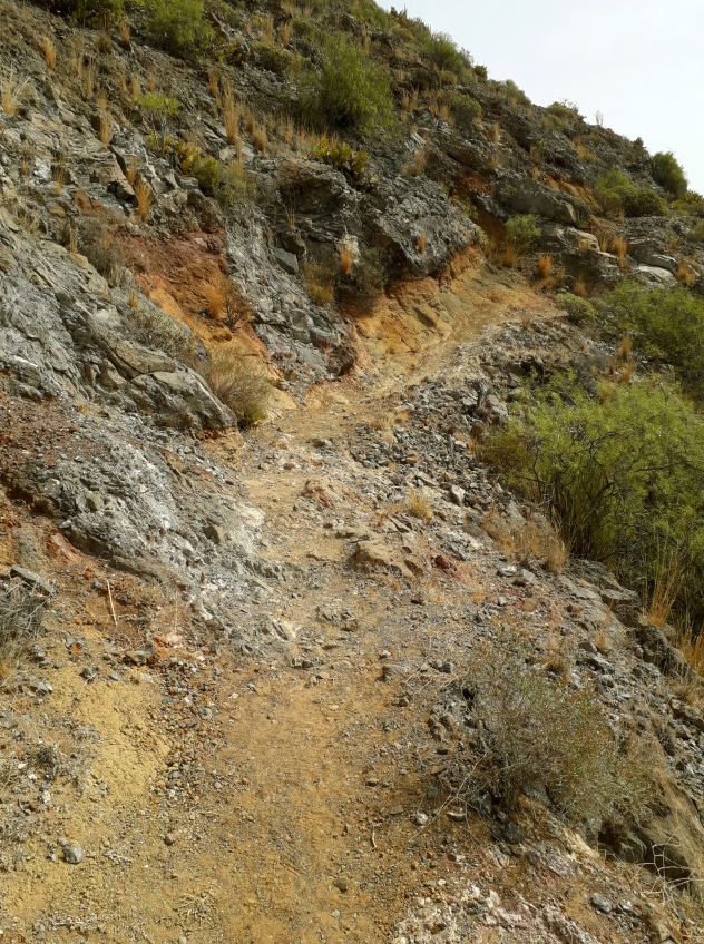 Auf dem Weg unterhalb des Rastplatzes geht es zunächst einmal 200 m weiter, mit einem kleinen, etwas steileren Aufstieg zu einem Bergrücken. Danach geht es links abwärts, wobei man den Weg aber zunächst etwas suchen muss. Er läuft steil abwärts auf einen Grat zu, und dort gibt es ein paar Stellen, wo man zwischen den Felsen hinunter klettern muss. Es ist ein kurzes, aber steiles Stück durch diese Felspartie, bis man schließlich unten im Tal ankommt.