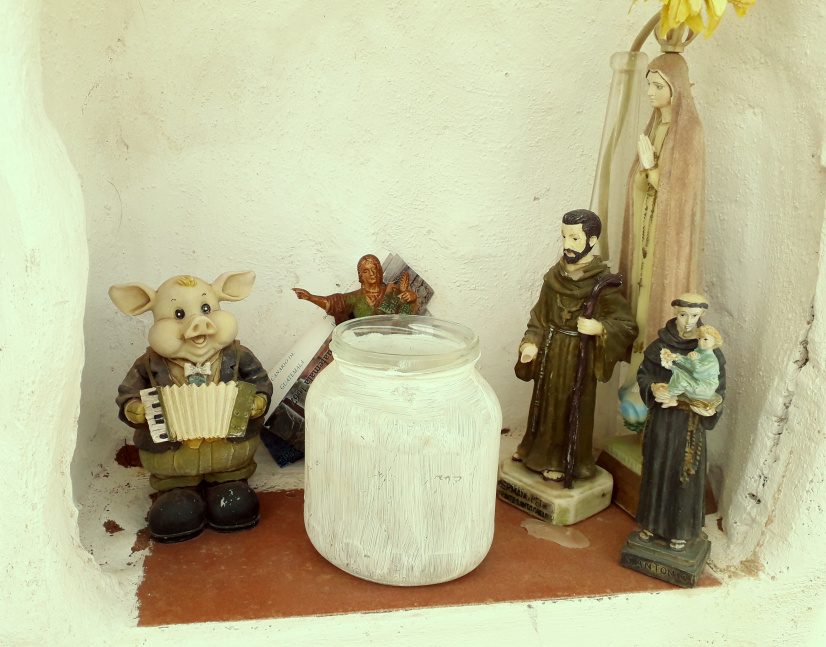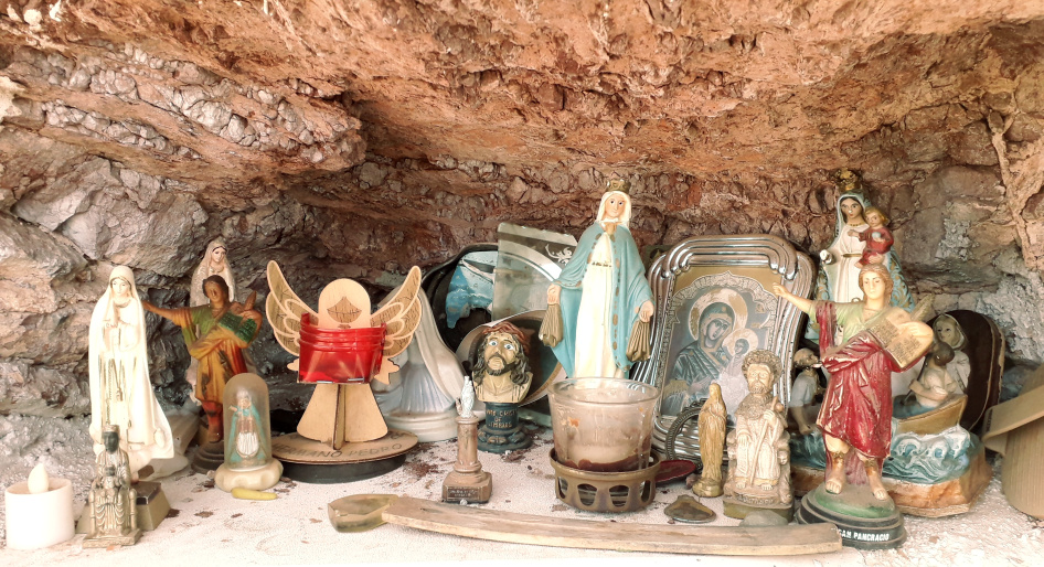 Man steigt hinauf zu dem Hochspannungsmasten und danach hinunter zum nächsten Sattel. Dort gibt es einen kleinen, interessanten Heiligenschrein in der Felswand mit allerlei Figuren und Bildchen. Die größte Figur stellt den Heiligen Bruder Pedro dar, den einzigen heiligen Ziegenhirten der Welt. Er stammte aus Vilaflor und betätigte sich Mitte des 17. Jahrhunderts in Guatemala als Missionar und Arzt. 2002 wurde er vom Papst heilig gesprochen.