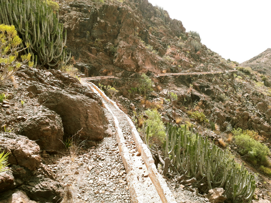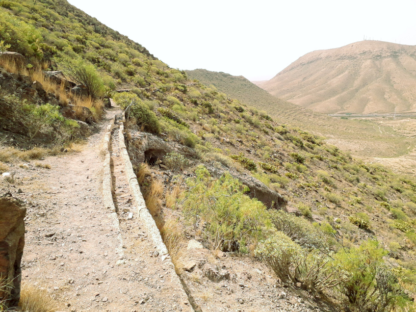 Direkt rechts daneben, an der roten Felswand, beginnt ein alter Kanal aus weißem Tuffgestein. Dort geht man neben dem Kanal auf einem Pfad weiter. Der Kanal ist immer wieder zerbrochen, und man sollte an einigen Stellen etwas Vorsicht walten lassen, besonders dort, wo es direkt an einer Felswand vorbei geht. Nach 400 m verlässt der Pfad den Kanal. Bald danach steht man wieder auf einem Sattel und hat nun einen Blick auf den Roque Igara von der anderen Seite.