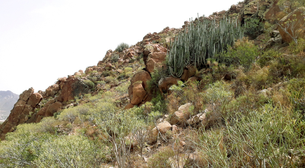 Man könnte zunächst einmal eben weiter gehen bis zu einem auffälligen, großen Cardón unterhalb eines braunen Felsens. Danach müsste man nach oben klettern, über lockere Steine und große Felsbrocken, zwischen stachligen Kakteen und klebrigen Tabaibas, an denen man sich nicht festhalten kann. Der Blick nach oben ist entmutigend, es sind rund 80 Höhenmeter allersteilstes Gelände. Noch einmal: Es gibt definitiv keinen Weg. Der Abstieg wird schwieriger sein als der Aufstieg. Bei einem Sturz gibt es keine Hilfe! 2021 musste ein 62-jähriger Wanderer hier mit dem Hubschrauber heraus geholt werden.