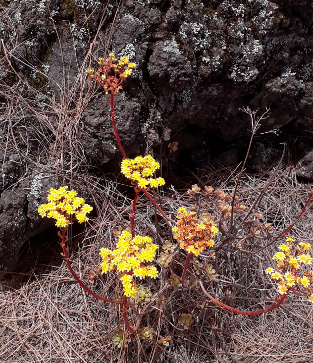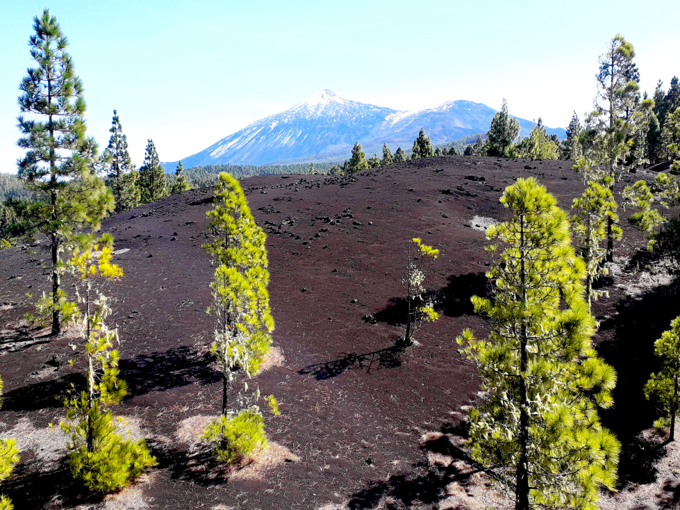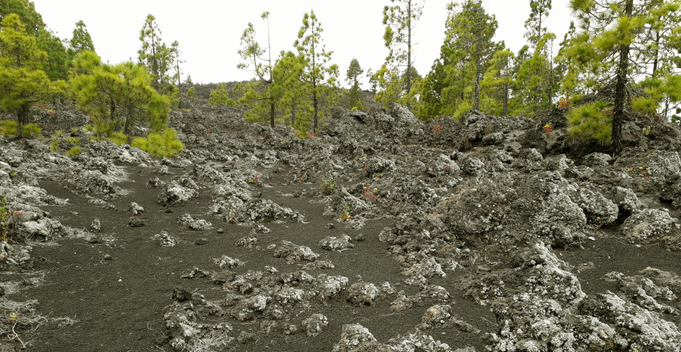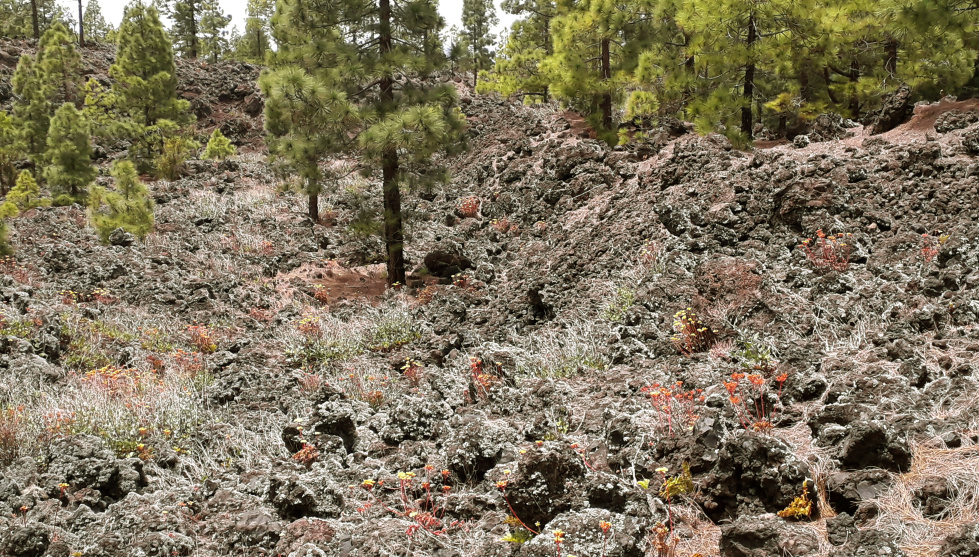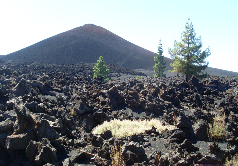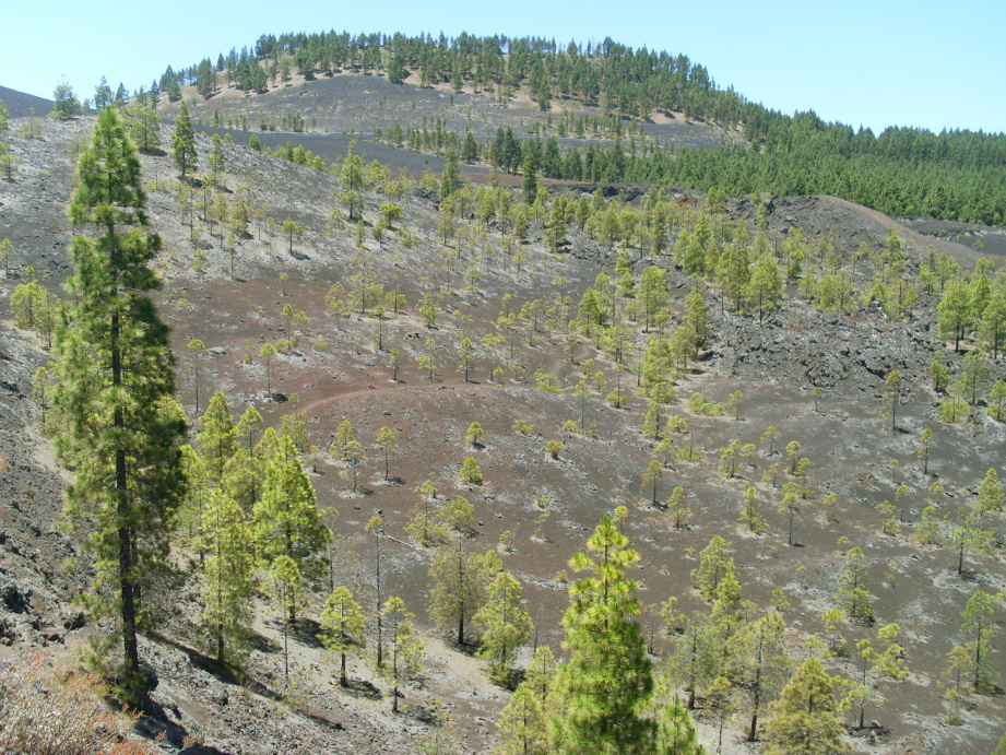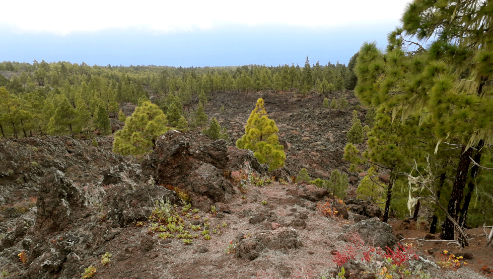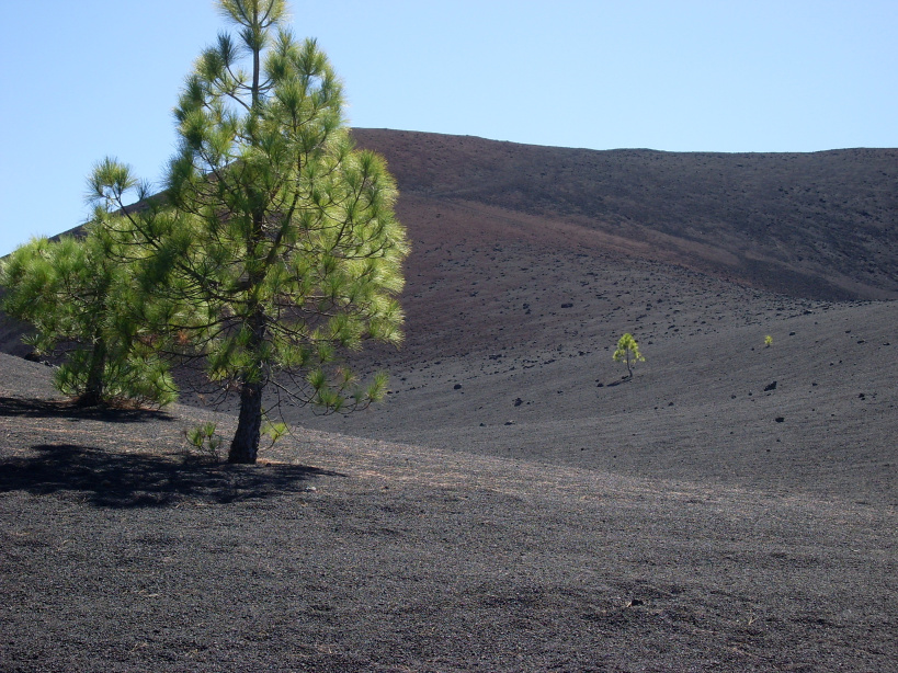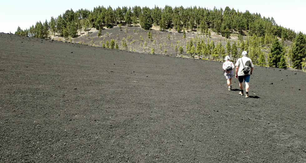 Man folgt dem mit Steinen markierten Weg über das Aschefeld und kommt danach auf der Nordseite des Berges durch den Lavastrom, der im Jahr 1706 so große Schäden verursacht hatte. Man sieht, wie nach mehr als 300 Jahren die Kiefern in den Spalten der Lava wieder Fuß gefasst haben. Der Kontrast zwischen den grünen Bäumchen und dem schwarzen Gestein ist faszinierend. Später kommt man durch ein weiteres Aschefeld. Dort sind die Bäume aber von der Forstverwaltung angepflanzt worden.
