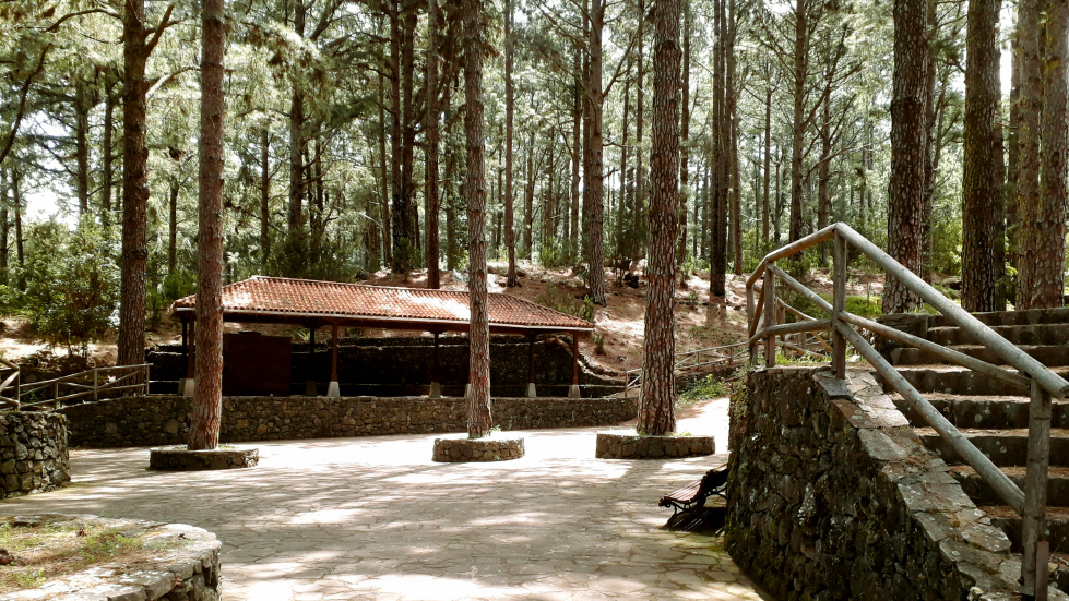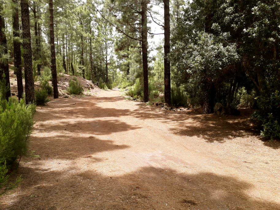 Danach führt der Weg etwas abwärts und weiter unten in den Wald hinein. Nach 150 m im Wald triff man auf den gut erkennbaren Wanderweg PR-TF-43.1. Achtung: Nicht nach rechts auf die Piste abbiegen, sondern bis zum Wanderweg eben weiter gehen. Nun geht es im schattigen Wald bergab, mal gerade, mal im Zickzack. Nach rund 2 km unterquert man eine Stromleitung und trifft 500 m weiter unten auf eine Straße am Rand des Dorfes San José de los Llanos. Hier geht man nach rechts und erreicht wenige Minuten später den großen Picknickplatz an der Hauptstraße. Am Wochenende ist auch die kleine Cafetería geöffnet.