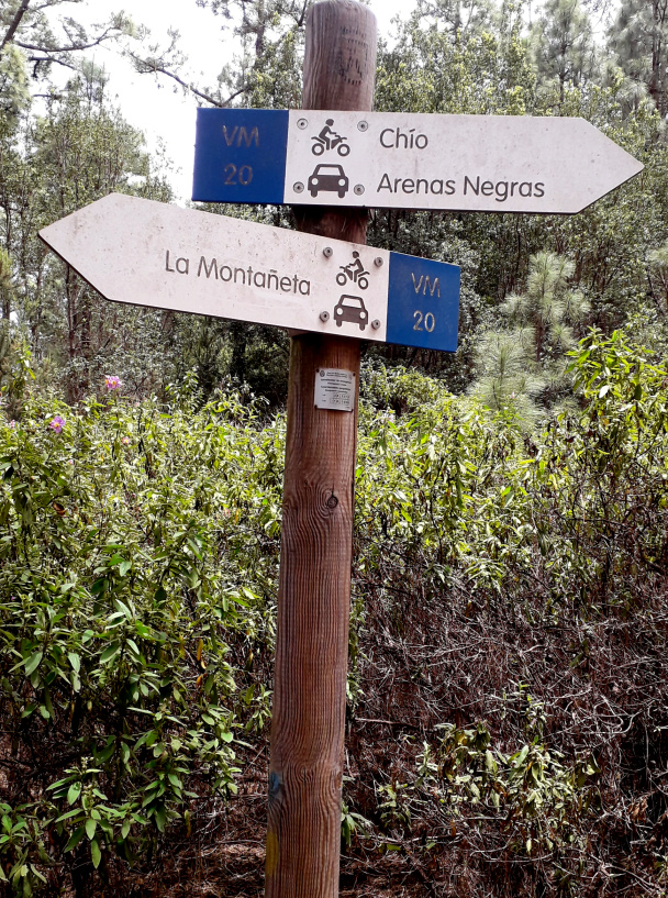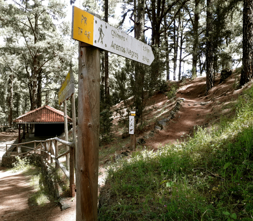 Von der Kapelle geht man nach hinten zum Kinderspielplatz und entdeckt dort den Wegweiser des Wanderwegs PR TF-43 Richtung Arenas Negras. Er ist gut bezeichnet und schön angelegt und verläuft zunächst in leichtem Auf und Ab unterhalb der Straße. Bald überquert man eine kleine Piste und geht dann neben der Straßenkurve etwas steiler bergauf. Der Weg ist mit Steinen eingefasst und nicht zu verfehlen. Nach etwa 15 Minuten kreuzt man die etwas breitere Pista Fuente Santa und folgt weiter der gelb-weißen Markierung.