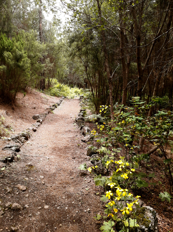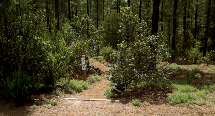 Er senkt sich nun merklich ab, bis man wieder zur Straße TF-373 kommt. Dort geht man etwa 30m nach rechts, wo auf der gegenüber liegenden Seite ein Waldweg abwärts beginnt. Wo dieser eine Rechtskurve macht, biegt man nach links ab und kommt gleich danach unter eine Stromleitung durch. Dann wird der Weg ziemlich schmal und verläuft durch viel dichtes Gebüsch bergab.