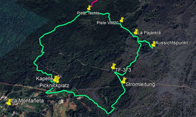 Auf der Piste trifft man nach 10 Minuten auf die befahrbare Schotterstraße VM 20, die von La Montañeta nach Arenas Negras führt. Man geht nach rechts unten und kommt fünf Minuten später, wo die Piste eine Rechtskurve macht, zu einem kleinen Steinhaus, dieser Ort heißt La Pajarera (Vogelkäfig). Hier wollte einmal ein Zoologe eine Vogelzucht einrichten, aber daraus wurde nichts.
