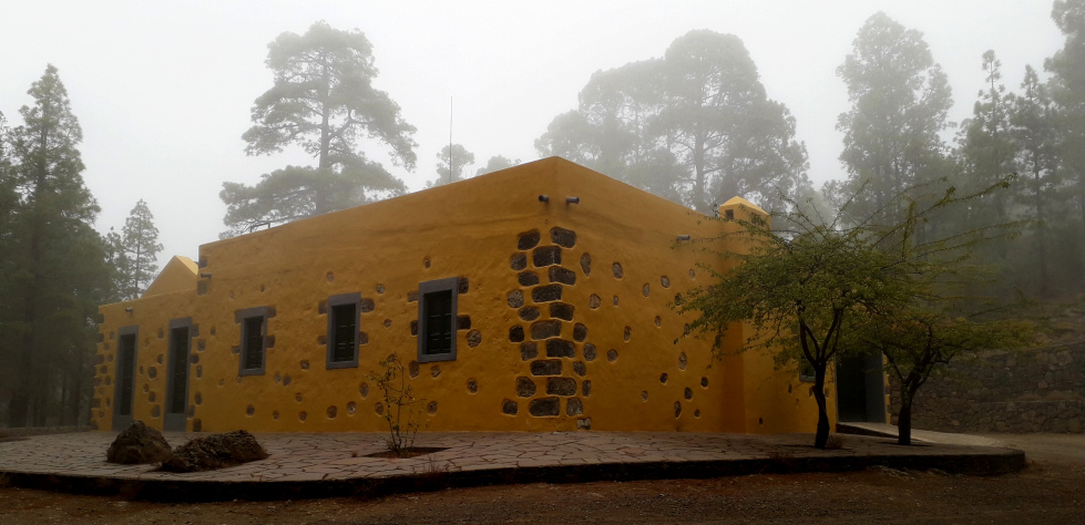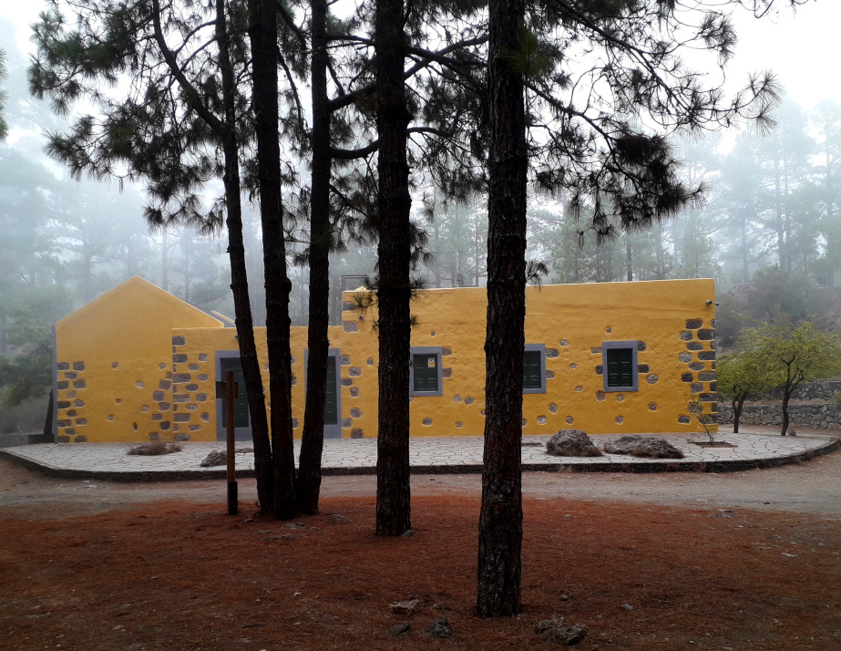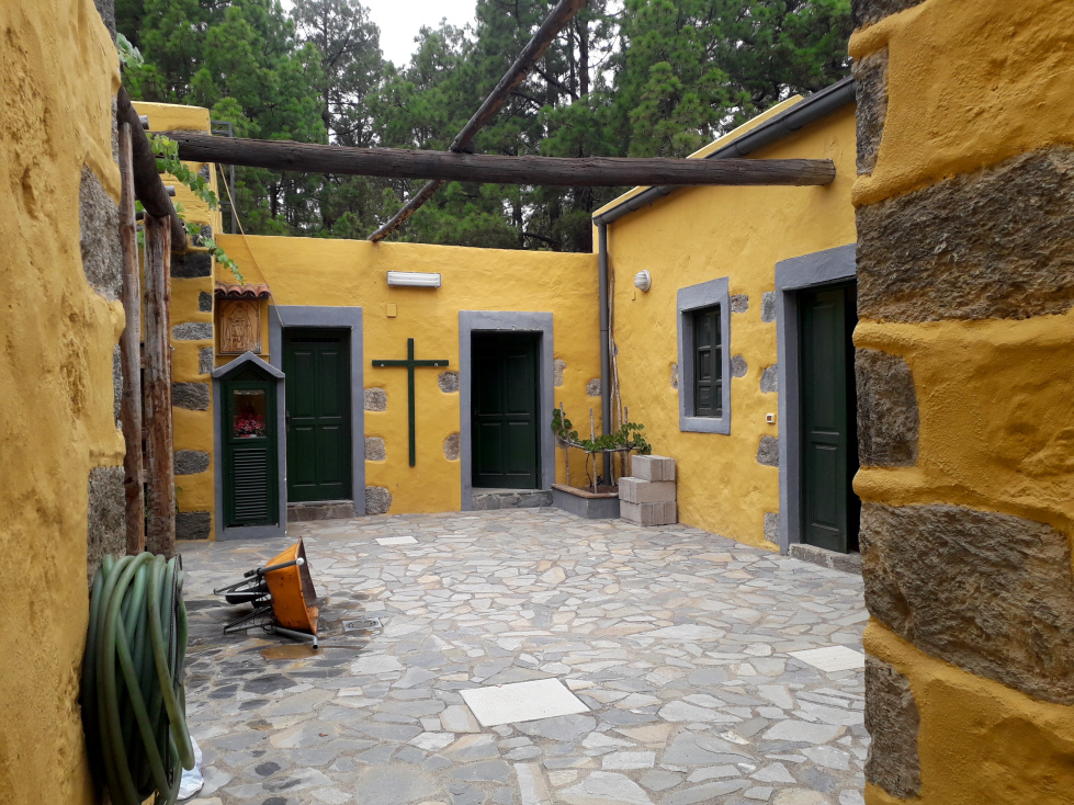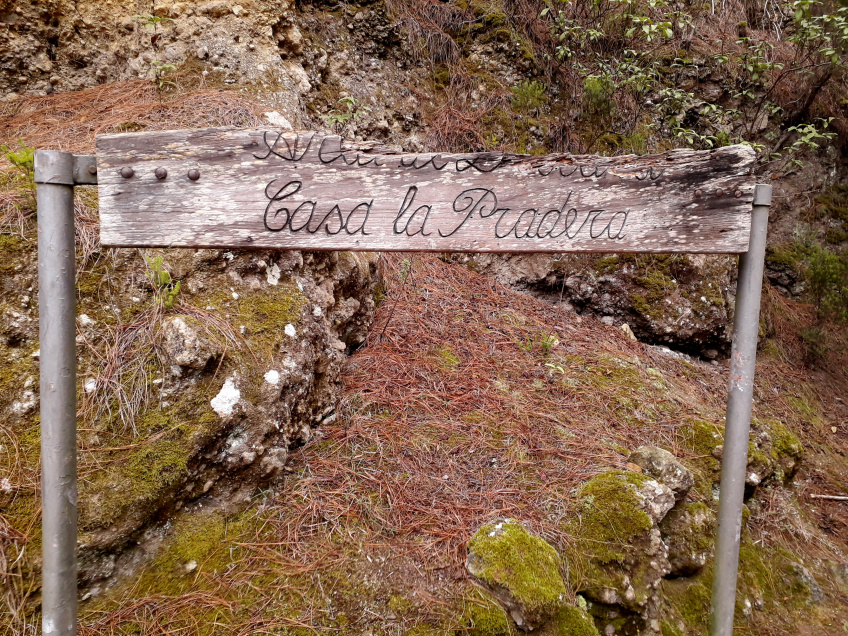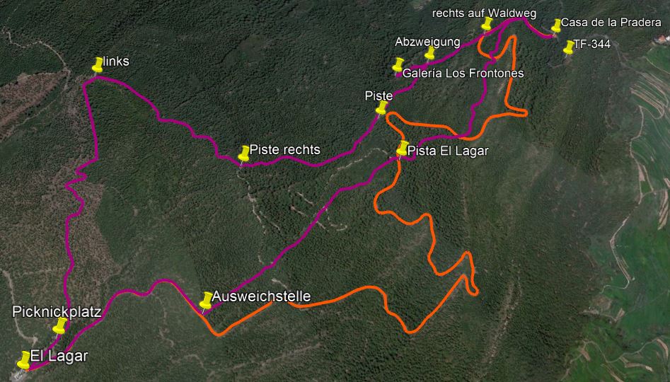 Oberhalb die Picknickplatzes sieht man das gelb angestrichene Steinhaus, das aber nicht besichtigt werden kann. Von dort (oder gleich links vom Picknickplatz aus) geht man auf der Pista El Lagar nach unten. Die erste Abzweigung rechts Richtung La Tahona lässt man unberücksichtigt. Nach 10 Minuten kommt man zu einer deutlich breiten Ausweichstelle auf der linke Seite. Genau dort beginnt der Abstiegsweg. Er ist schmal und mitunter steinig und etwas steiler und kreuzt alle paar Minuten eine Piste. Wenn man immer geradeaus weiter geht, kann man nichts falsch machen. Man trifft dann nach 20 Minuten wieder auf die Pista El Lagar und geht direkt neben dem Wegweiser wiederum geradeaus im Wald weiter. 5 Minuten später kreuzt man wieder die Pista El Lagar, und nach weiteren 15 Minuten kommt man am Startpunkt der Wanderung wieder heraus.