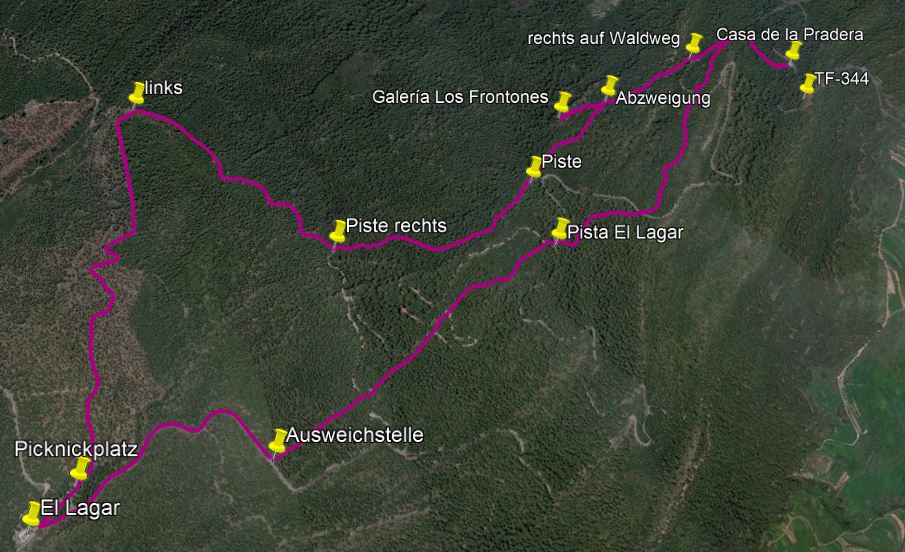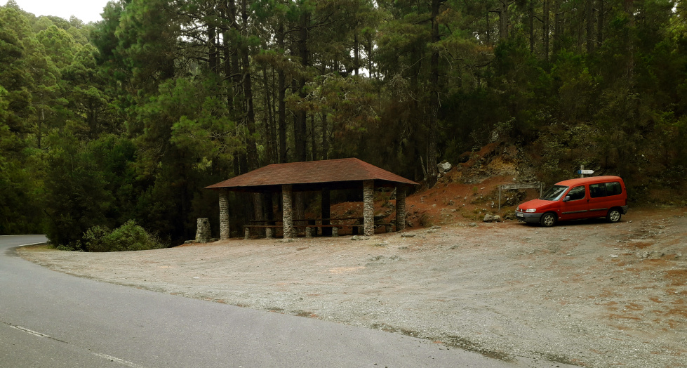 Er beginnt an der TF-344 bei km 8,8. Diese Stelle heißt Casa de la Pradera, dort steht ein Dach mit einem Tisch darunter und dort kann man parken. Die Pista El Lagar beginnt genau hier.
