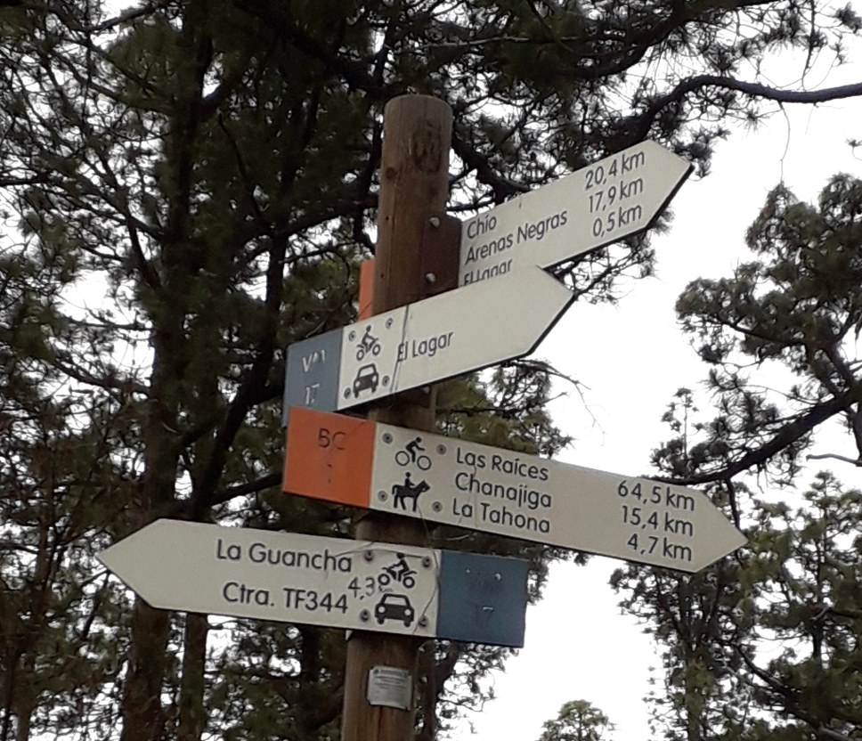 Nach weiteren 20 Minuten trifft man auf eine breite Piste. Nun geht es nach rechts wieder etwas bequemer weiter, rund 700 m. Der zweite (!) Weg nach links ist ein gelb-weiß markierter, offizieller Wanderweg (PR TF 42.1). Abgesehen von einem kurzen steileren Stück führt er nun leicht ansteigend nach 1,2 km direkt zum Picknickplatz El Lagar. Dort ist sicherlich auch eine ausgiebige Rast angesagt. Es gibt auch Wasserstellen mit Trinkwasser.