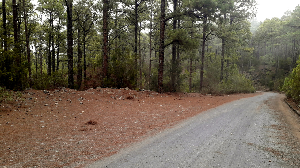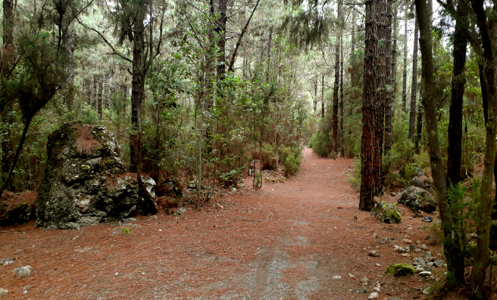 Man geht das kurze Stück zurück zu der Verzweigung und nimmt dort den linken Weg, der gleich ziemlich steil ansteigt, man kann aber auf einer Kurve die steilste Stelle umgehen. Der Weg führt nun durch Gebüsch aufwärts und trifft nach knapp 20 Minuten auf einen breiteren Waldweg, wo man nach rechts geht. 100 m weiter sieht man links eine kleine Schlucht, die zum Barranco de las Goteras gehört. Kurz danach geht man wieder nach links auf den Wanderweg, der nun etwas steiler und ziemlich schmal wird, aber es gibt keine Abzweigungen.
