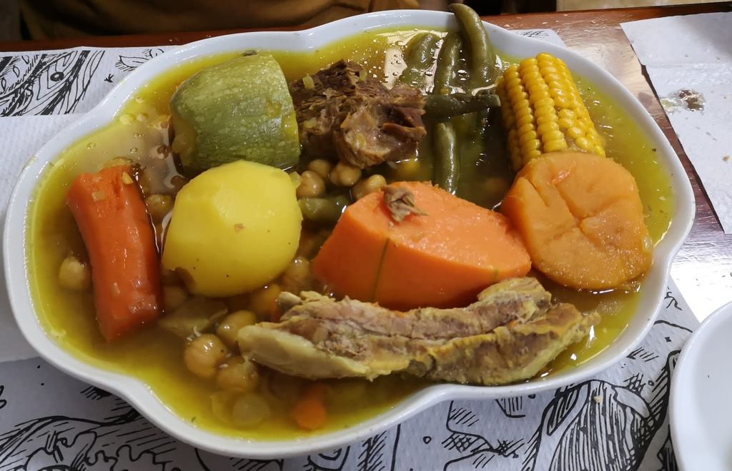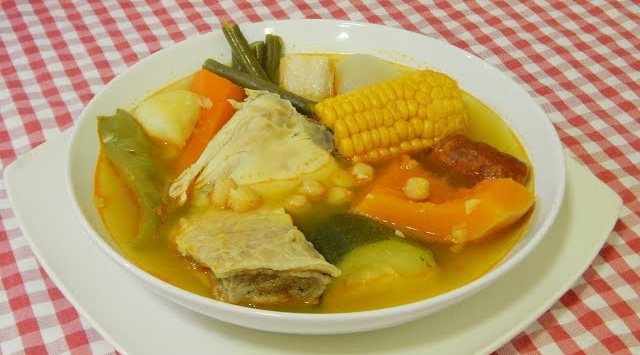 Ein bisschen Fleisch muss sein. Rindfleisch, egal was, Schweinerippchen, oder auch Huhn. Ganz egal. Ein Stück Wurst kann auch nicht schaden. Aber viel Gemüse auf jeden Fall. Kartoffeln sind dabei und Süßkartoffeln. Kürbis, Karotten, Zwiebeln, grüne Bohnen, Kohl und Bubango, die runde Zucchini. Chayotas, die Stachelgurken. Kichererbsen gehören dazu, aus dem Glas oder rechtzeitig eingeweicht. Nicht fehlen darf auch ein Maiskolben, oder zwei, damit nicht nur der Papa einen abkriegt.