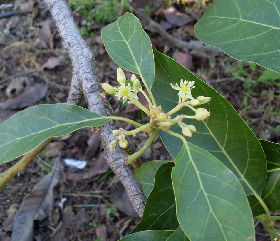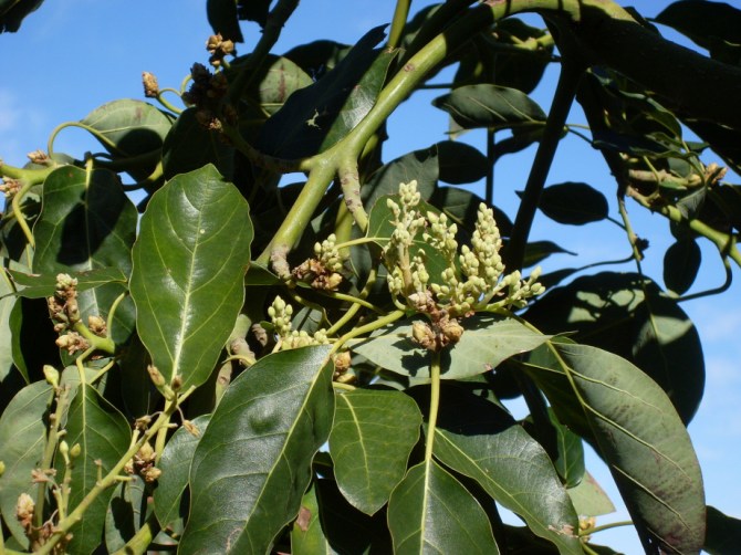 Der Avocadobaum (persea americana) gehört zu den Lorbeergewächsen, was man leicht an den ledrigen, glänzenden Blättern erkennen kann. Diese werden im Winter nicht abgeworfen, im Urwald gibt es ja keinen Winter. Hier auf Teneriffa lassen die Bäume die meisten Blätter im Frühsommer fallen, wenn die Blütezeit vorbei ist und neue Triebe sprießen. Diese sind zunächst weich und biegsam und haben leicht rötliche Blätter.
