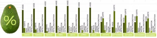Die wichtigste und häufigste heißt „Hass“. Sie hat eine raue, runzelige Schale und ist eher eiförmig. Sie wird auf Teneriffa von Januar bis Juli geerntet. Die Sorte „Fuerte“ ist mehr birnenförmig und hat eine glatte Schale, sie ist eher kälteresistent und kann auch in höheren Lagen angebaut werden. Die Erntezeit liegt im September bis Dezember.
