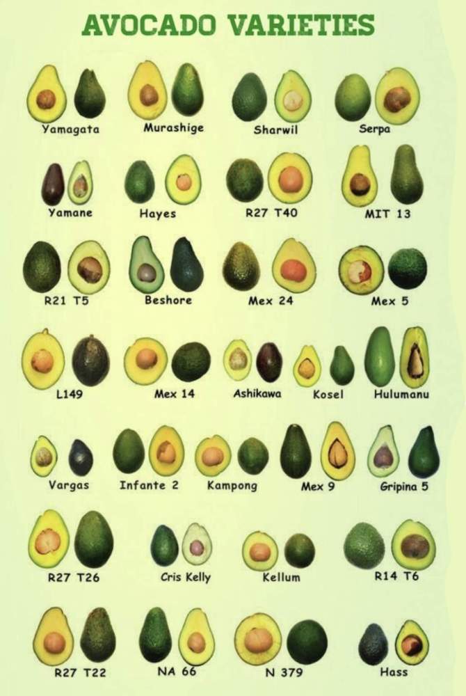 Weltweit gibt es über 400 Sorten. In der Landwirtschaftsabteilung der Inselregierung arbeitet man an 87 verschiedenen Sorten, von denen 15-20 eine Chance auf kommerzielle Nutzung haben. Interessant ist die Sorte „Reed“, weil bei ihr die Erntezeit im Sommer liegen würde, sie hat fast kugelrunde Früchte. „Bacon“ hat eine ganz glatte und dünne Haut, „Pinkerton“ produziert am meisten Früchte pro Baum, „Pollock“ oder „Choquette“ können in Florida besonders groß werden und mehr als ein Kilo wiegen.