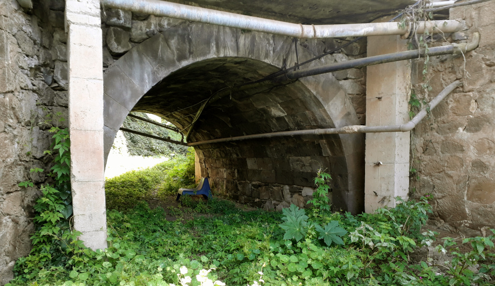 Unterhalb des Hauses, auf der rechten Talseite (talauswärts), steigt man ein paar Treppen hoch und überquert dann die Kanalbrücke. Sie ist schmal, aber zum Glück gibt es ein Geländer.