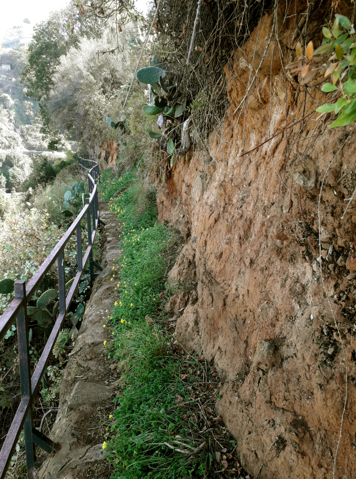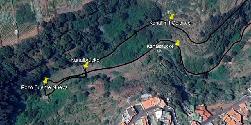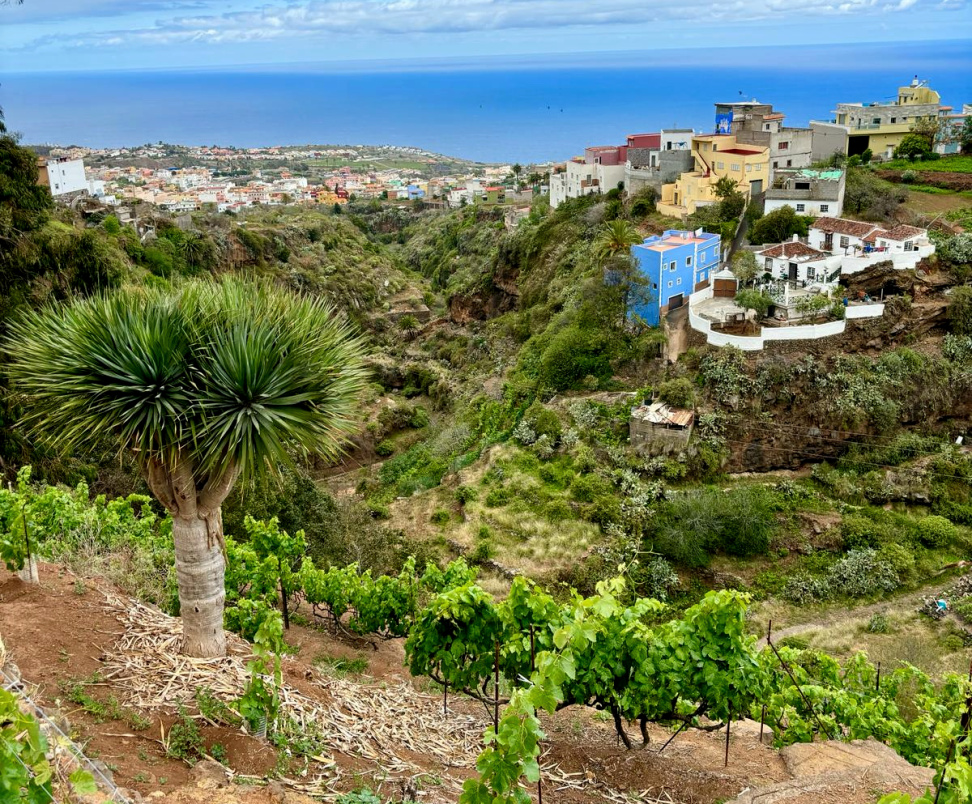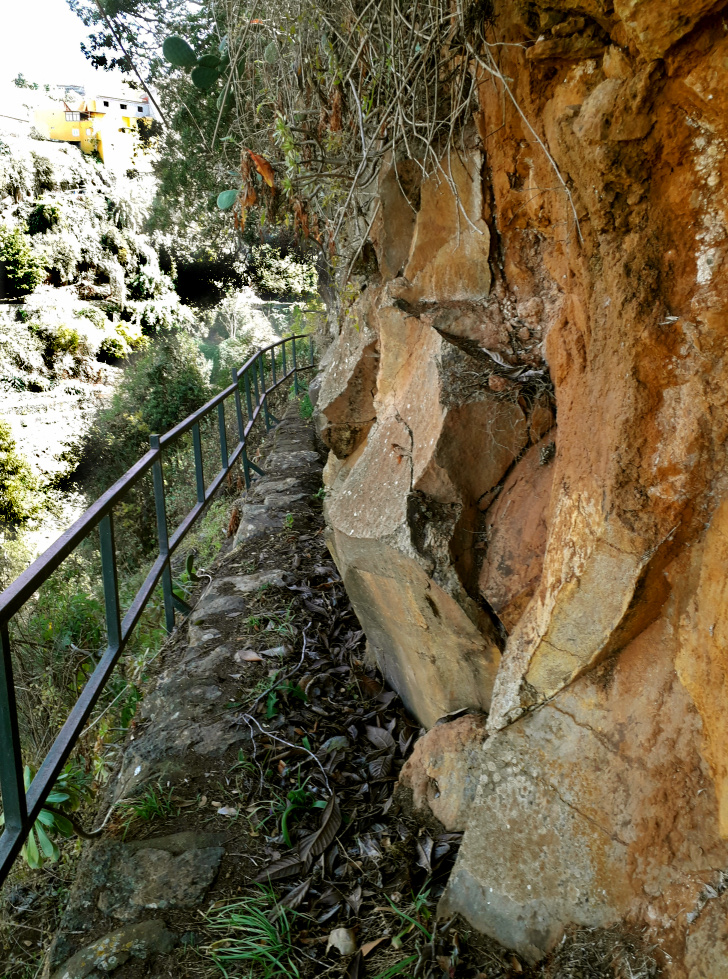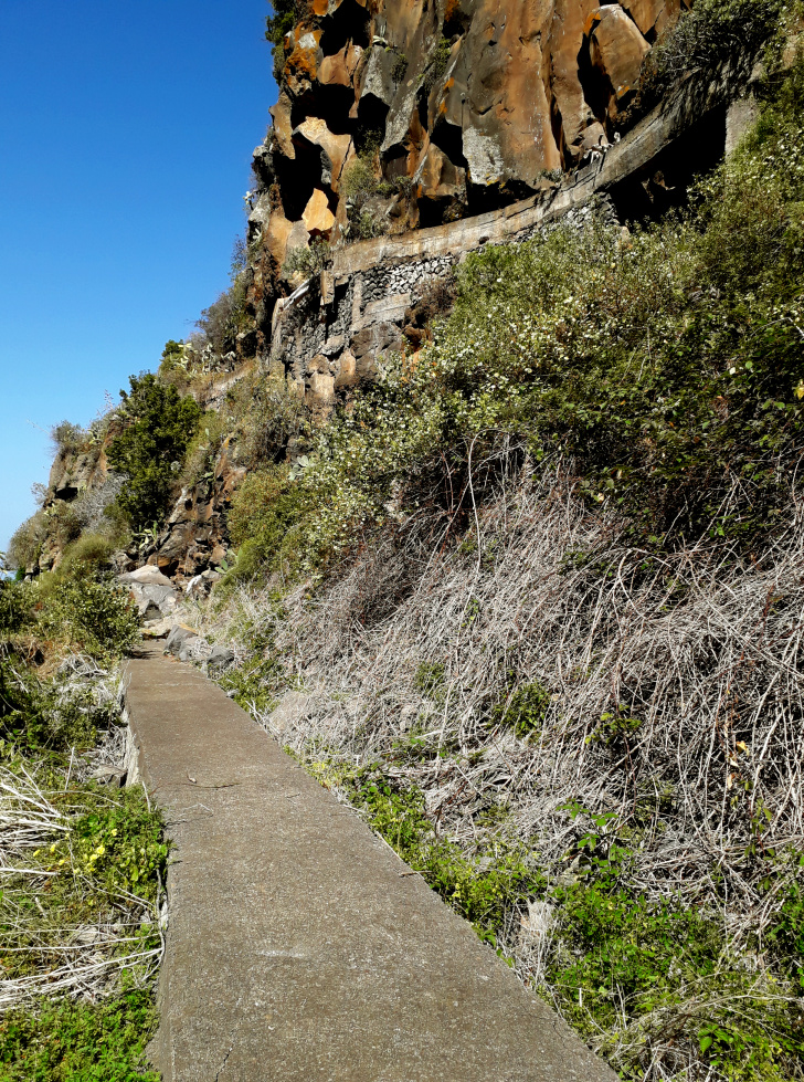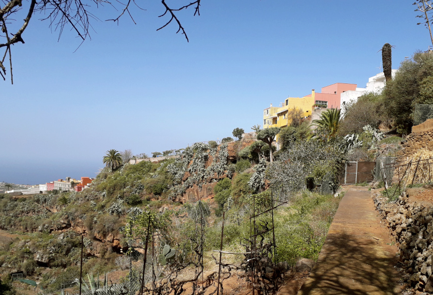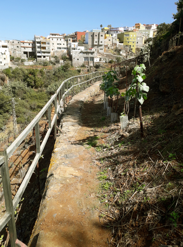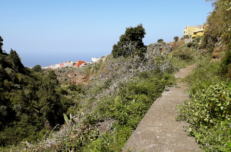 Nun beginnt ein wunderschöner Weg an den Felswänden entlang, und man geht etwa einen halben Kilometer auf dem Kanal. Auch hier gibt es ein Geländer. Schon bald befindet man sich hoch über der Schlucht und hat herrliche Ausblicke Richtung Santa Úrsula und das Meer. Gegenüber sieht man die Häuser der Straßendörfer Tagoro und La Vera, die schon zu La Victoria gehören. Man kommt noch einmal durch Weinberge hindurch, dann endet der Kanalweg in der Calle La Viquita.