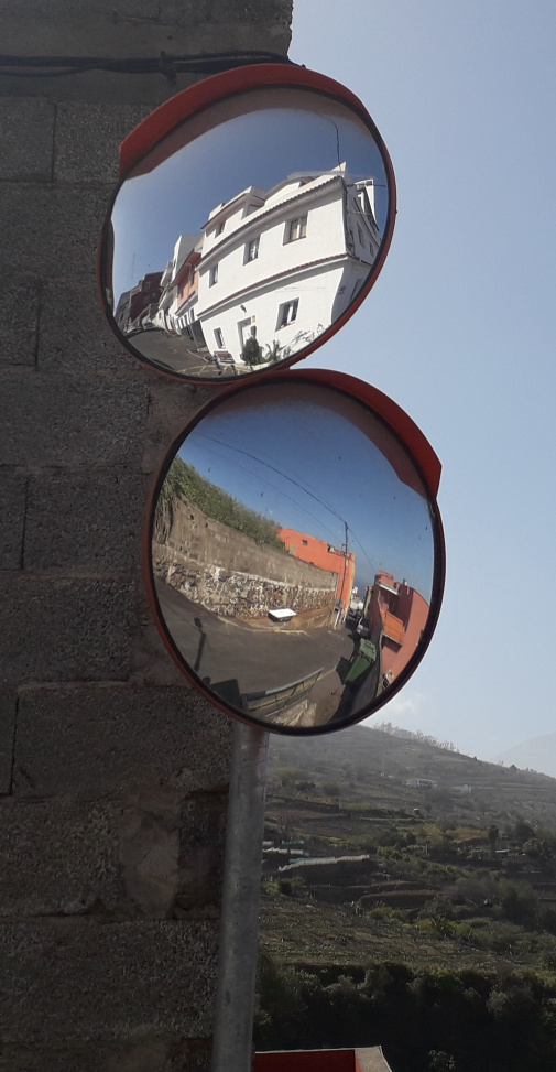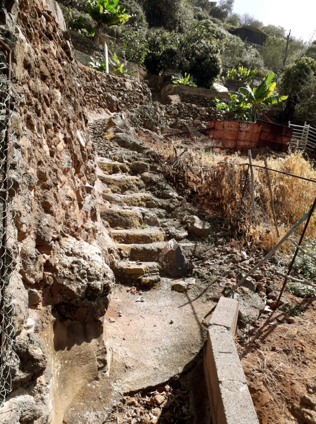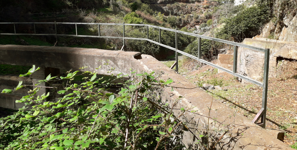 Ein paar Meter unterhalb der beiden Straßenspiegel biegt man nach links in eine schmale Gasse zwischen den Häusern. Danach kommt man wieder durch Gärten, die auf schmalen Terrassen angelegt sind und man blick in die nächste Schlucht. Es geht über einige Stufen und ein kurzes steiles Stück nach unten bis zum Canal del Norte. Er liefert das Wasser von Aguamansa bis nach La Laguna.