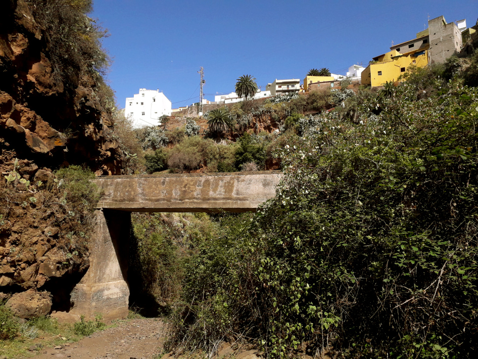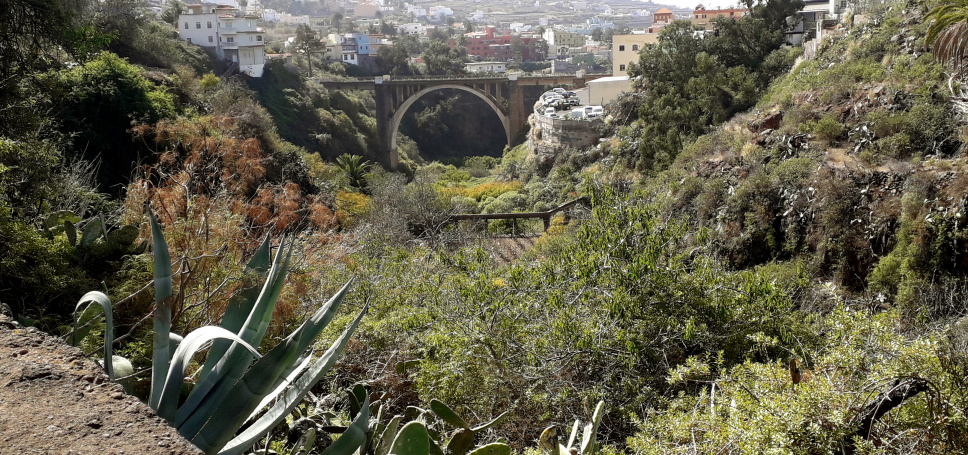 Dort nimmt man die steile Straße den Berg hoch, sie führt in den Stadtteil Tosca de Ana María. Nach der Rechtskurve geht es eben weiter, und bald wird die Straße zu einem wilden Feldweg, der abwärts in den Barranco verläuft. Blickt man hier nach links, dann sieht man die oben erwähnte Brücke Alfonso XIII.