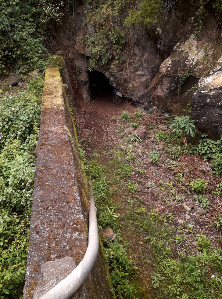 Ganz am Ende, nach 1,3km in der Schlucht, unterquert man zwei Kanalbrücken. Kurz danach entdeckt man ein interessantes Bauwerk. Es ist der Brunnen Fuente Nueva. Durch die Gitterabdeckung kann man hinein schauen und hört das Wasser plätschern. Es ist schwierig abzuschätzen, wie tief der Schacht ist. Unterhalb des Brunnens liegt der Ausgang des 4352 m langen Wasserstollens. Die Fördermenge der Fuente Nueva ist kontinuierlich zurück gegangen. Sie lag 1985 bei 38,7 Litern/Sekunde und 2020 nur noch bei 24,1 Litern/Sekunde. Gegenüber steht das Arbeits- und Lagerhaus, das aber verschlossen ist.