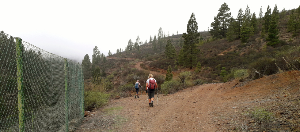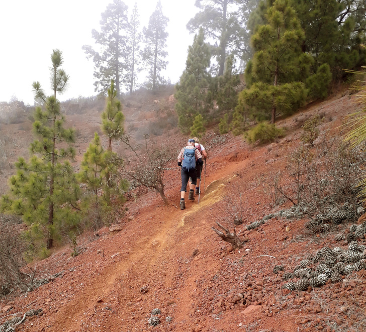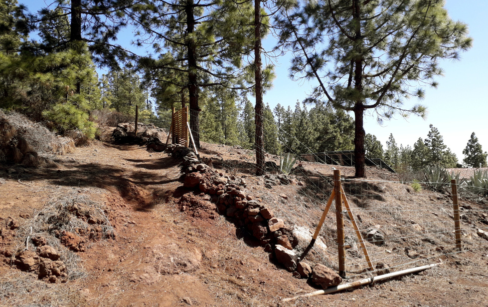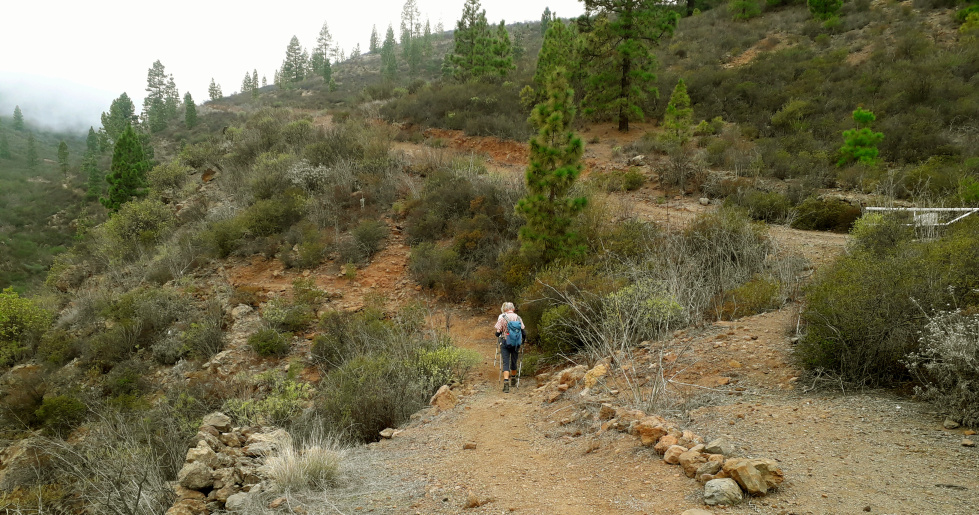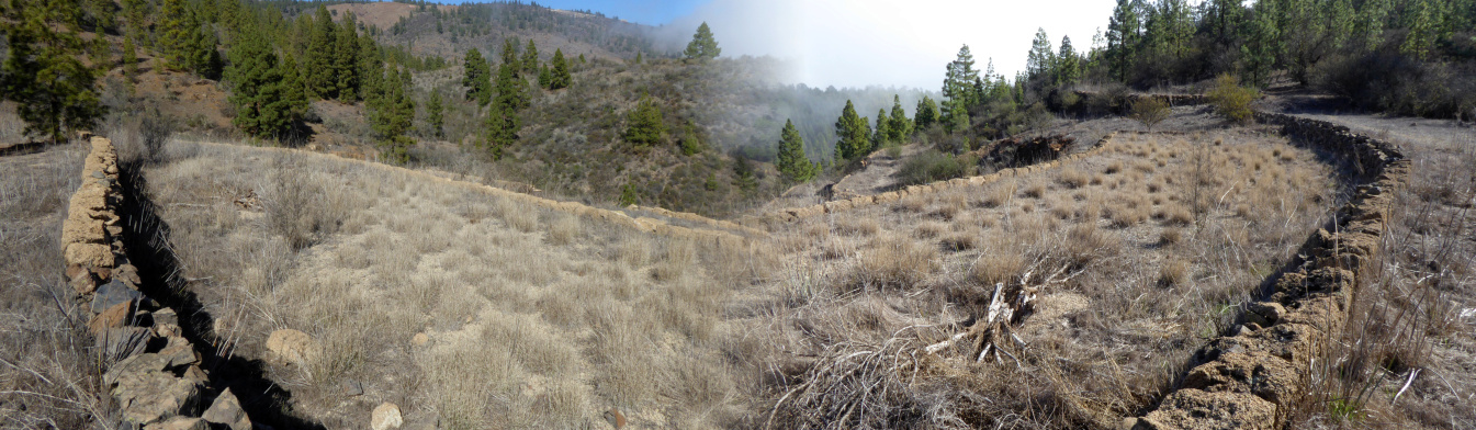 Der Wanderweg senkt sich dann langsam und bequem wieder ab, allerdings ist der Pfad teilweise sehr ausgewaschen. Nach einem kleinen Wäldchen geht man nach rechts weiter. Von links kommt hier der Weg der Route 2 aus Vilaflor. Wieder sind hier die großen Terrassenfelder zu bewundern. In einem Taleinschnitt knickt der Weg scharf nach rechts und verläuft weiter talabwärts.