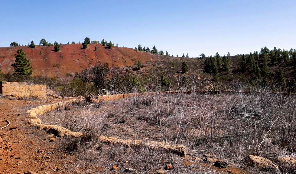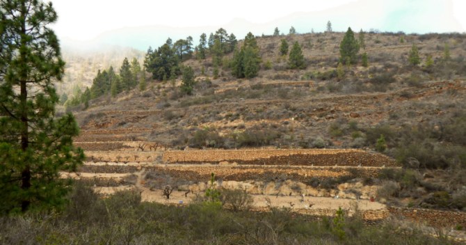 Dort kommt man an den neu bewirtschafteten Terrassen vorbei, die man schon von oben gesehen hat. Hier wachsen Weinstöcke und Apfelbäume, aber sie haben in den letzten Jahren unter der Trockenheit schwer gelitten. Auf den Feldern liegt der weiße Jable, diese Steinchen bringt man als Verdunstungsschutz auf die Erde aus. Es gibt hier auch kleine Höhlen in dem leicht zu bearbeitenden Gestein, wo die Bauern Geräte, Ernte und Vorräte aufbewahren können.