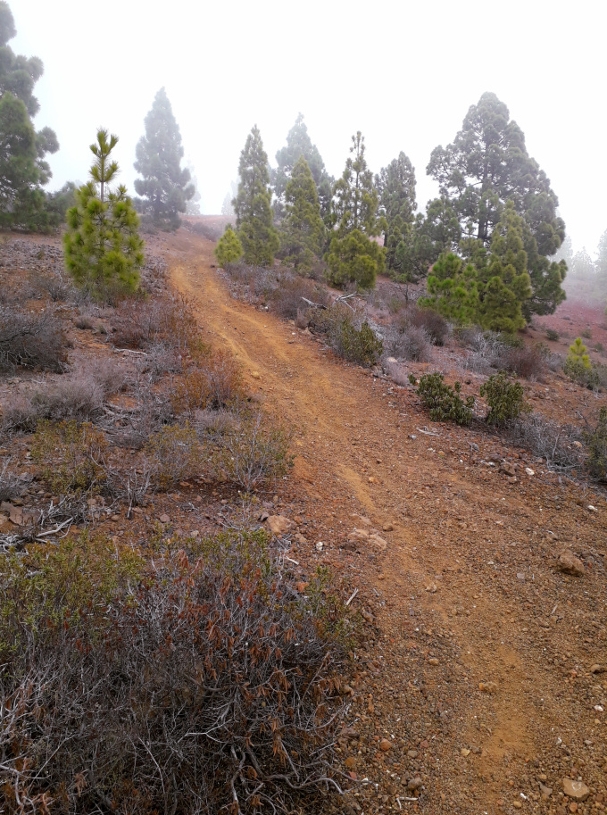 Man kommt dann auf einen Sattel und kreuzt eine Piste. Diese wäre ein Verbindungsweg (Karte grün), falls man die große Route von Vilaflor aus machen will. Geradeaus weiter und halb rechts nach oben gäbe es einen Direktaufstieg auf die Montaña Colorada (Karte hellgrün). Aber gleich 10m nach der Piste zweigt davon links ein kleinerer Wanderpfad ab, schwierig zu sehen, aber es liegt ein Stein als Markierung da.