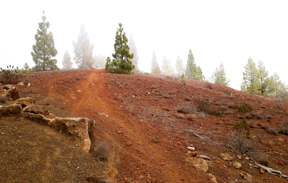 Weiter am Hang entlang geht es aufwärts, bis man zu einer Verebnung kommt, wo fast nur noch der rote Boden vorherrscht, ein schöner Kontrast zu den grünen Kiefern. Dort ist eine Wegkreuzung, und der weitere Aufstiegsweg auf die Montaña Colorada klar zu erkennen. 30 Höhenmeter weiter oben steht auf der Spitze des Berges eine Steinsäule als Mess- und Orientierungspunkt.