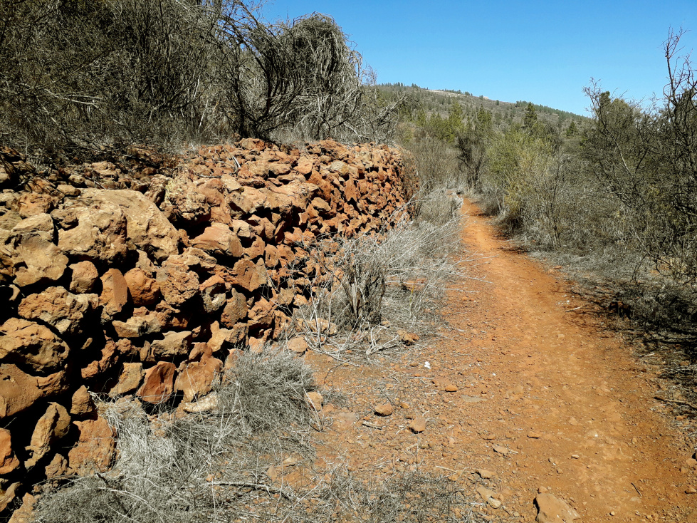 Immer wieder bewundert man die hohen Natursteinmauern, ebenfalls aus aus dem roten Gestein gefertigt. In früheren Zeiten wurde hier oben Getreide angebaut. Rechts oberhalb des Weges liegt noch ein großer Dreschplatz. Er ist aber fast ganz im Gebüsch verschwunden, und es ist schwierig, dort hin zu kommen.
