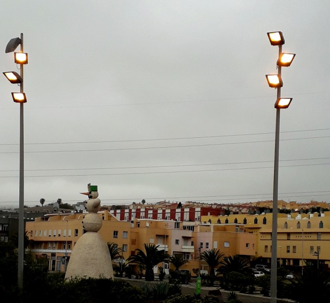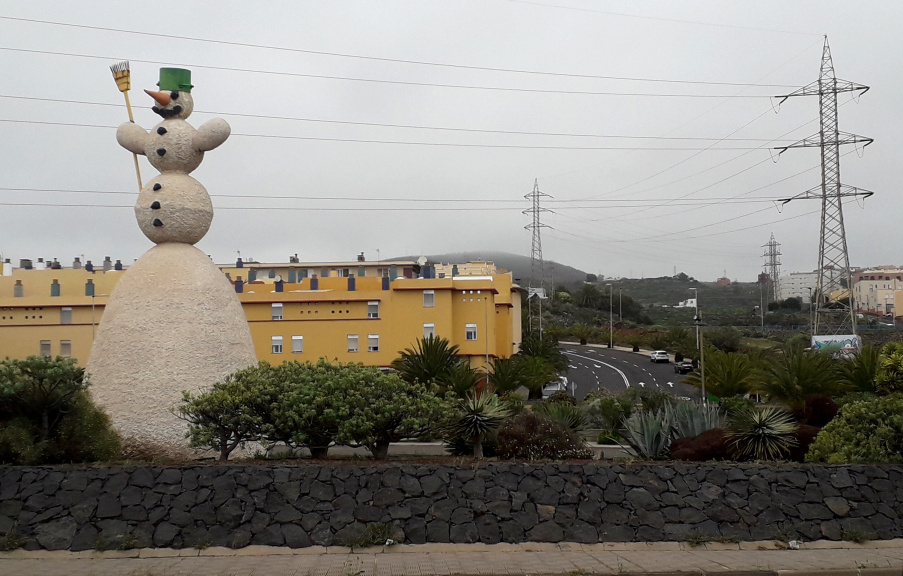 Und der hässlichste ist in Santa Cruz, jedenfalls, was das Kunstwerk in seiner Mitte angeht, denn jeder Kreisverkehr muss natürlich ein Kunstwerk in der Mitte haben. Hier dreht es sich um einen Schneemann, der Muñeco de nieve. Schon 2013 ging er durch die Medien als eines der hässlichsten Kunstwerke Spaniens. Im Jahr 2018 stimmten mehr als 8000 Personen in dem Blog Strambotic des Journalisten Iñaki Berazaluce darüber ab, wer zur „Miss Horrotonda“ gekürt werden solle. Auf den Kanaren gewann eindeutig der Muñeco de nieve von Santa Cruz.
