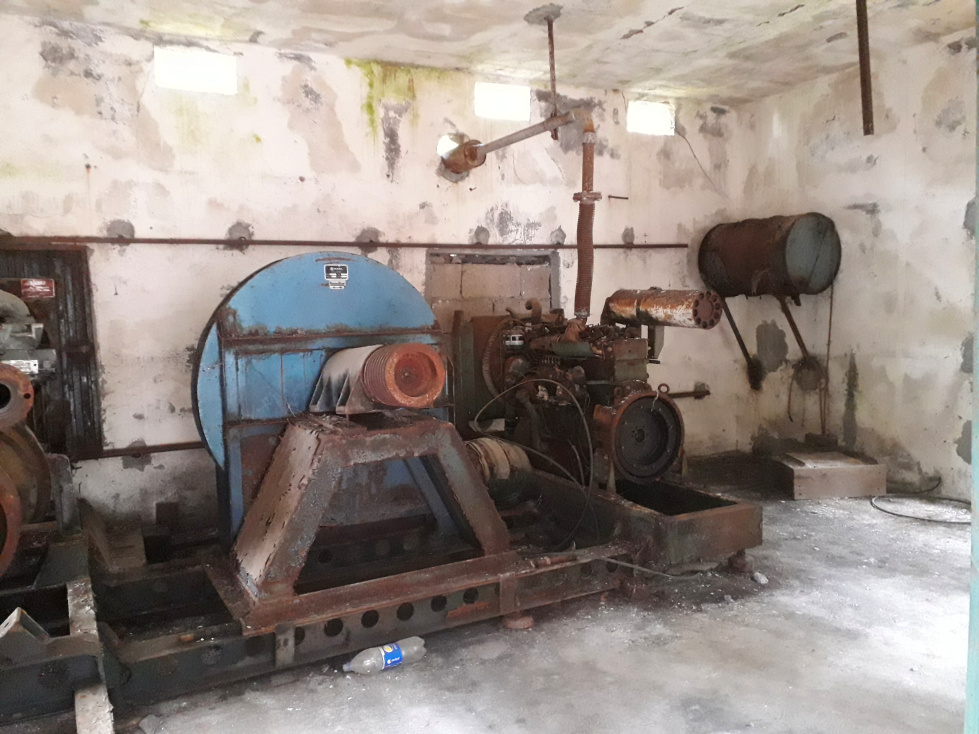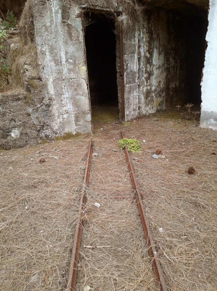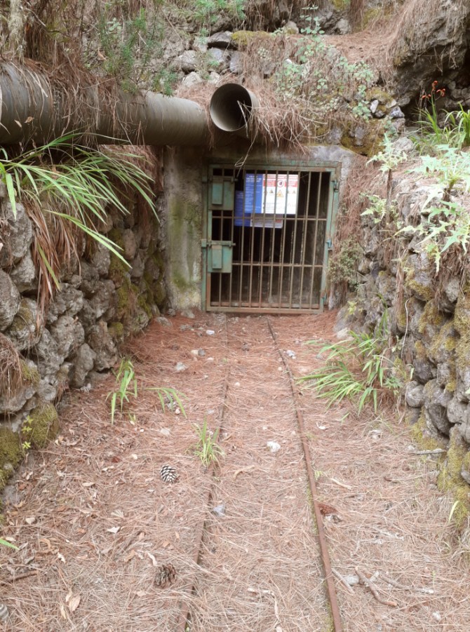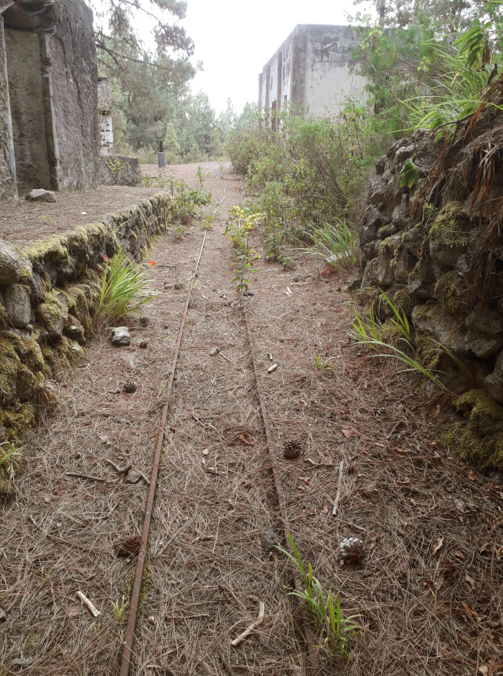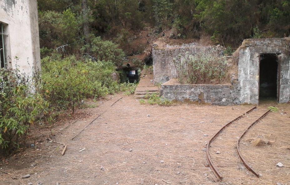 Verrostete Schienen kommen aus dem Wasserstollen und führen zur Abraumhalde. Im Schuppen stehen altertümliche Maschinen. Der Stollen führt 4600m tief in den Berg hinein und zapft das Wasservorkommen unterhalb des Teide an. Wenn man direkt am versperrten Eingang des Stollens steht, spürt man einen kühlen Luftzug aus dem Berg.