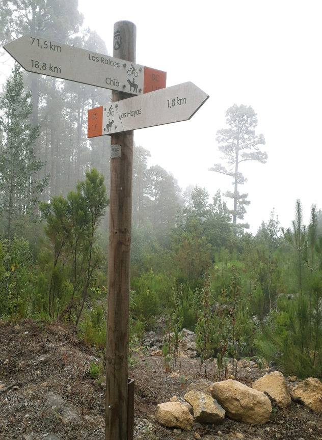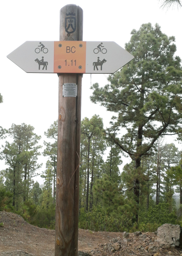 Nun bleibt man auf der Piste, die alsbald nach rechts schwenkt und mit BC 1.11 bezeichnet ist. Man kommt zu einer auffälligen Kreuzung, wo man weiter auf der BC 1.11 geradeaus geht, es geht gemächlich bergab. 1920m nach der Kreuzung ist wieder der Picknickplatz Las Hayas ausgeschildert. Wer es bequem haben will, nimmt diese Richtung nach rechts und geht hinunter bis zur Piste des Hinwegs und auf dieser zurück.