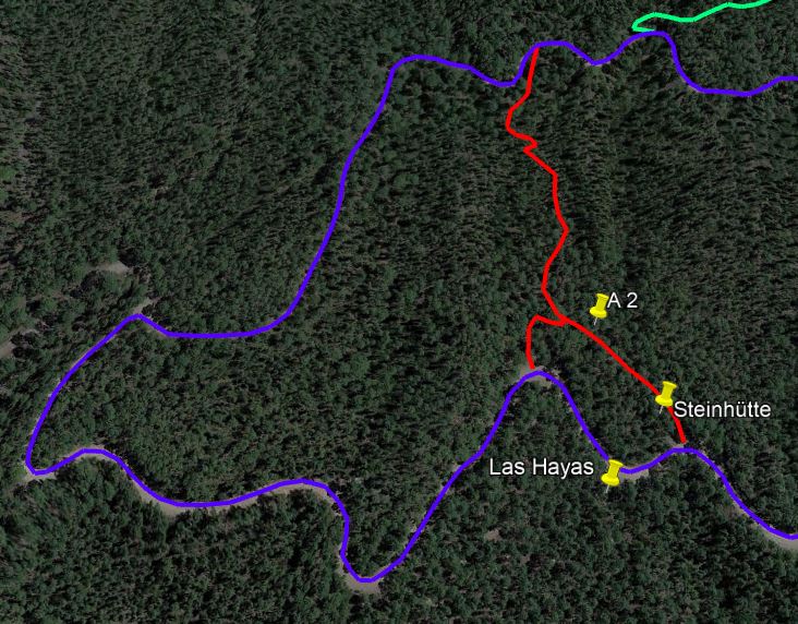 Spannender ist jedoch der Direktabstieg durch den Dschungel. 10m nach links und dann nach rechts in die Büsche (A4). Es geht zwar nicht sehr steil abwärts, aber lockere Steine und Kiefernnadeln machen den Weg etwas rutschig. Er spart aber rund 800m.