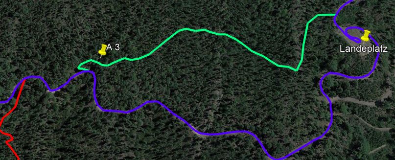 Dort geht man 100m nach rechts. Hinter der scharfen Linkskurve zweigt in der nächsten Rechtskurve ein Pfad spitzwinklig ab (A3). Dies ist wieder ein schöner, wilder Weg durchs Gebüsch, der zuerst etwas steiler, dann flacher ansteigt. Verlaufen kann man sich nicht, das Gebüsch wäre zu dicht. Er trifft nach 480m wieder auf eine Piste und spart etwa 280m.