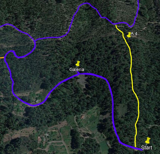 420m weiter gibt es die erste Möglichkeit, sich auf einer Abkürzung (A1) durch den Dschungel zu schlagen. Bevor die Piste eine deutliche Rechtskurve macht, kann man links auf einem Waldpfad bergauf steigen. Dort liegt ein größerer Felsbrocken, hinter dem ein zunächst undeutlicher Pfad bergauf geht, er ist aber kurz danach besser erkennbar. Nach 160m trifft er wieder auf die Piste. Die Abkürzung spart etwa 320m, ist aber kurz etwas steil.