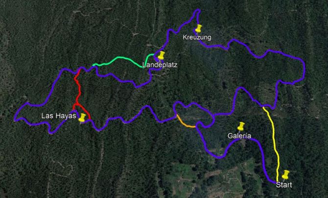 Bemerkung: Beim Wandern ist ein Navigationssystem empfehlenswert. Die Gegend ist sehr unübersichtlich. Open Street Map zeigt alle Pisten korrekt an. Wer sich nicht mehr sicher fühlt, geht im Zweifelsfall immer bergab und trifft irgendwann wieder auf die Hauptpiste von Las Hayas.