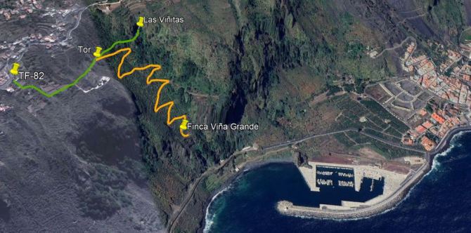 An der TF-82, etwa bei km 4,3 liegt die Arepera La Viñitas. Kurz danach beginnt bei einem kleinen Drachenbaum eine Seitenstraße, die absolut unvermittelt steil bergab geht. Zwischen Gärten und Weinfeldern geht es abwärts. Nach 180m knickt die Straße nach links und nun geht es eben weiter. Man kommt dann zu einem überraschenden Punkt, wo man plötzlich hinunter sieht nach Garachico. Hier endet der Asphalt, und dort wurde eine kleine Ausfahrt mit Steinen gepflastert, damit die Bauern, die hier her müssen, wenden können. Hier beginnt eine steile Piste, die hinunter führt zur Finca La Viña Grande.