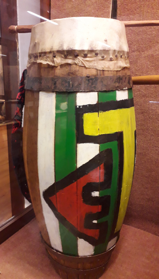 Gleich am Eingang kommt man wahrscheinlich zuerst in den Raum der Musikinstrumente. Dies ist die älteste Abteilung des Museums. Man sieht hier alles, womit in Lateinamerika Musik gemacht wird. Ein bunt bemaltes Tamboril aus Kiefernholz und Fohlenleder stammt aus Uruguay, die Zabumba aus Brasilien ist mit Ziegenleder bespannt. Natürlich gibt es auch verschiedene Varianten den typisch kanarischen Gitarre, dem Timple zu sehen.