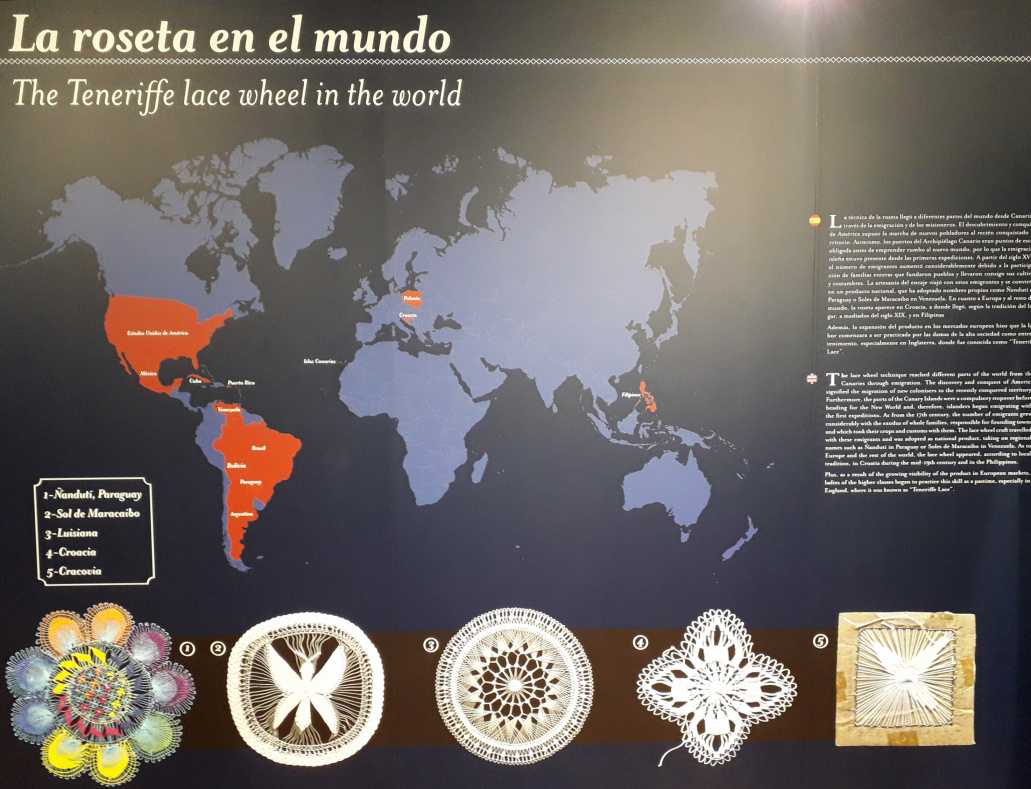 Der Herstellung und Verbreitung der Rosetas ist ein besonderer und großer Raum ist gewidmet. Den Rosetas wird eine solche Bedeutung beigemessen, um die seit 2016 angestrebte Erklärung dieses handwerklichen Stils zum Kulturgut (BIC) für die Kanarischen Inseln zu untermauern. Zu sehen ist z.B. ein spektakuläres englisches Kleid aus dem späten 19. Jahrhundert (viktorianische Ära), das zeigt, wie diese Formen in der Vergangenheit in den Kleidern wohlhabender Familien verarbeitet wurden. Die so genannten Jasminrosetten sind eine Technik, die fast verloren gegangen wäre. Die ältesten Stücke sind Rosetten aus dem 17. und 18. Jahrhundert sowie gestickte Kragen aus dem späten 19. und frühen 20. Die meisten Stücke der verschiedenen handwerklichen Spezialitäten stammen jedoch aus den 1940er Jahren und kommen aus allen lateinamerikanischen Ländern, Portugal und den Philippinen. Die Technik der Herstellung von Rosetten wurde jedoch ursprünglich von Teneriffa aus in diese Länder exportiert. Mit den Auswanderern reisten sie in die Welt, nach Mexiko, Paraguay oder Venezuela, wo sie die „Sonnen von Maracaibo“ genannt wurden. Im 19. Jahrhundert kamen sie auch nach Kroatien oder auf die Philippinen.